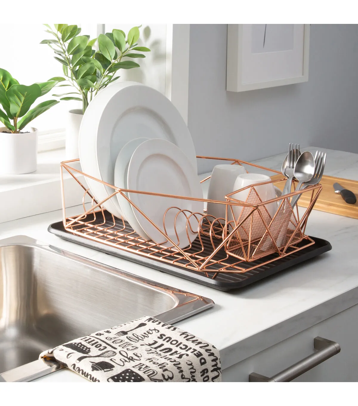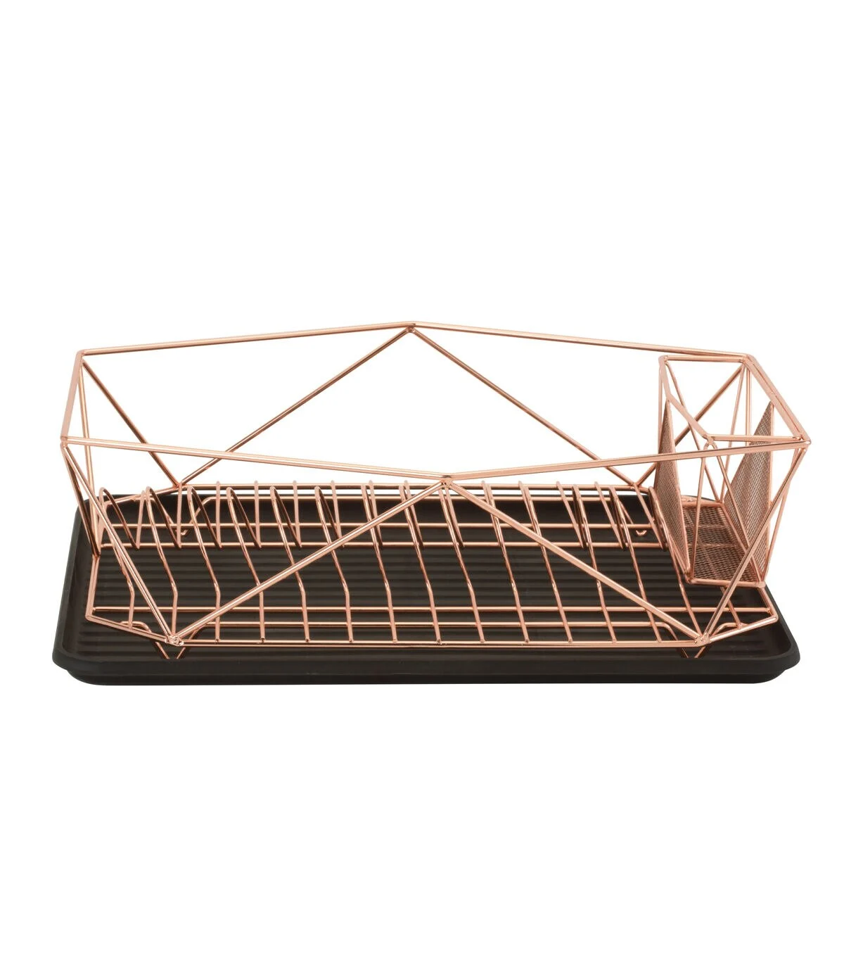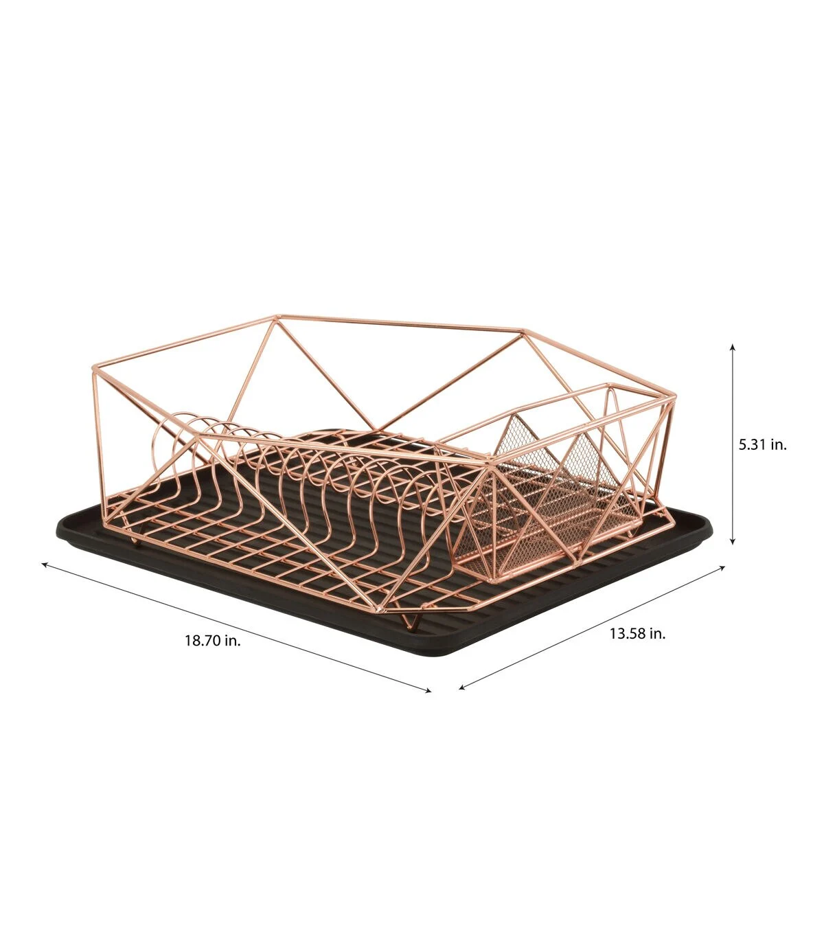 The Kitchen Details dish rack adds style and functionality to your kitchen countertop. Perfect for all your dish drying needs, this rust resistant iron construction dish rack will be long lasting. The deep bin of the rack holds mugs, plates, glasses, pots and many other items. Includes a spacious and deep capacity gadget or utensil caddy and a removable drain board. The open design allows the water to drain.
