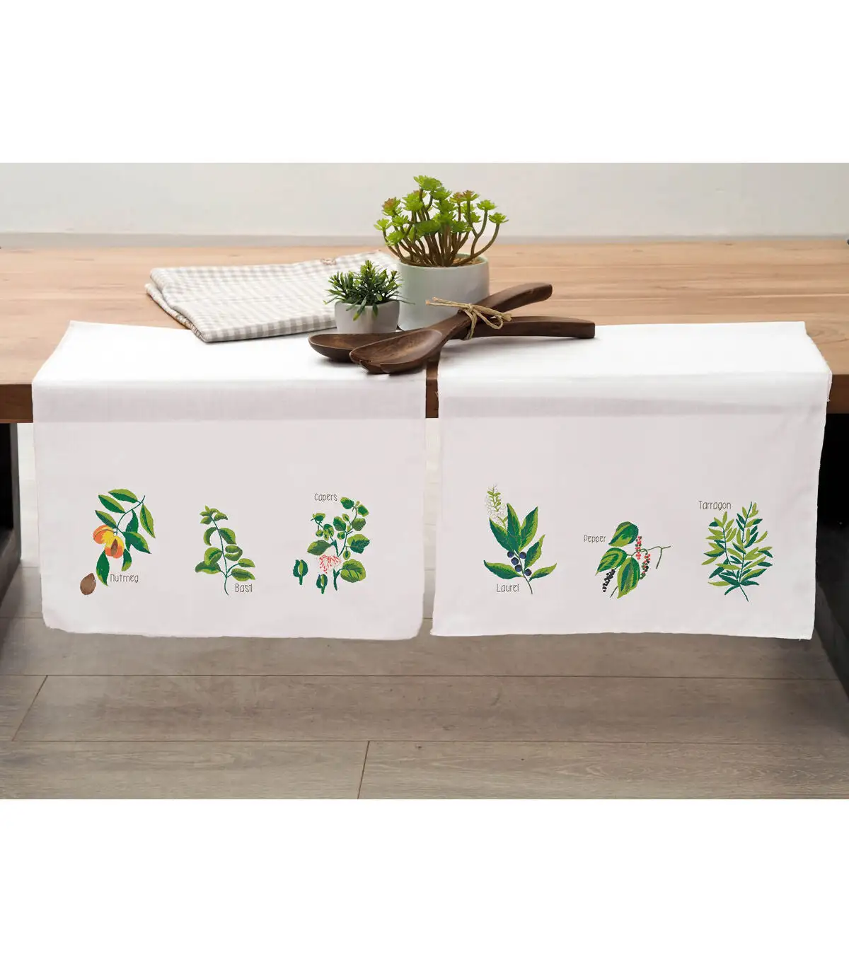 Leisure Arts Kits contain everything you need to create your project unless otherwise stated. Leisure Arts Tea Towel 17x28' Herb 2pc- Stamped cross stitch design features 6 herbs (nutmeg, basil, capers, laurel, pepper, and taragon). Kit includes stamped white, high-quaity percale woven fabric, sistch chart, diagrams, and recommended floss colors. Makes 2 designs. Colors and contents may vary.