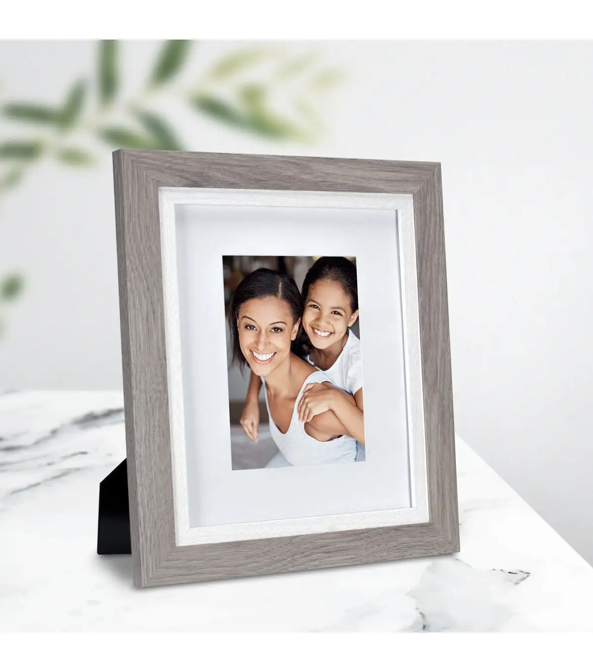 Add a touch of stylish rustic charm to your home decor with this beautiful photo frame from Malden International Designs. This decorative two-tone beige and white matted frame is the perfect way to display your treasured photos. This frame is constructed of sturdy MDF wood with a wood grain finish, white inner border and beveled white mat. This frame holds a 5x7 inch photo in a 4.5 x 6.5 inch opening with mat or an 8x10 inch photo in a 7.5 x 9.5 inch opening without mat. An easel back allows for horizontal or vertical display on any tabletop or shelf. This picture frame includes hardware on the back, making it easy to hang on a wall. A durable glass front will protect and showcase your precious memories for years to come. It is simple to load with quality swing tab closures on a removable back panel. This one of a kind frame makes a great gift for birthdays, holidays and more.