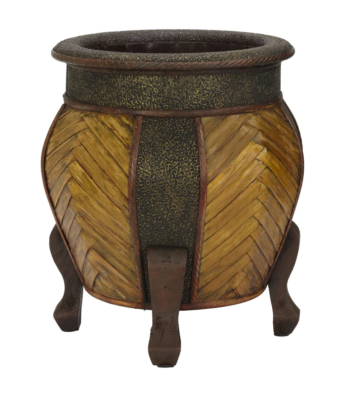 In a set of two (which doubles your decorating possibilities), this vase collection is sure to add to any Nearly Natural floral arrangement it holds. The 15 inch high and its smaller 10.75 inch sibling are both decorated with upward angled thatch design next to an intricately pressed vine patterned decoration. Each detained pattern is separated with rope designed trim. Comes on four thick and study cocoa colored legs for stability.