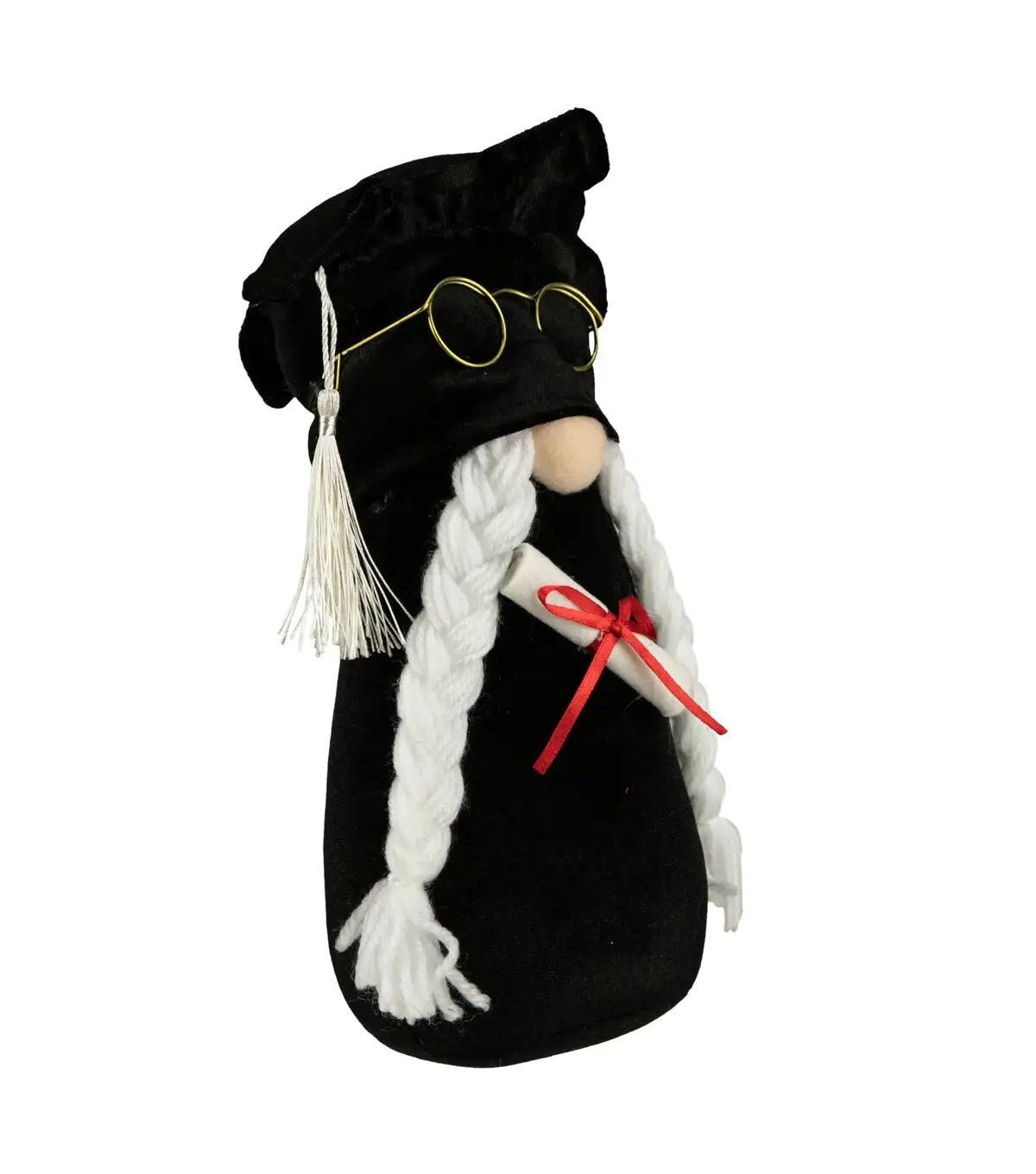 Gnomes are best known for guarding Earthly treasures providing good luck and are perfect for protecting your goodies. This gnome is wearing a black graduation cap and gown with silver wire glasses and holds a diploma. Her large bulbous nose and long white braids poke out from her hat. Place this gnome on your mantle or alone on any table for the perfect Graduation party decoration.