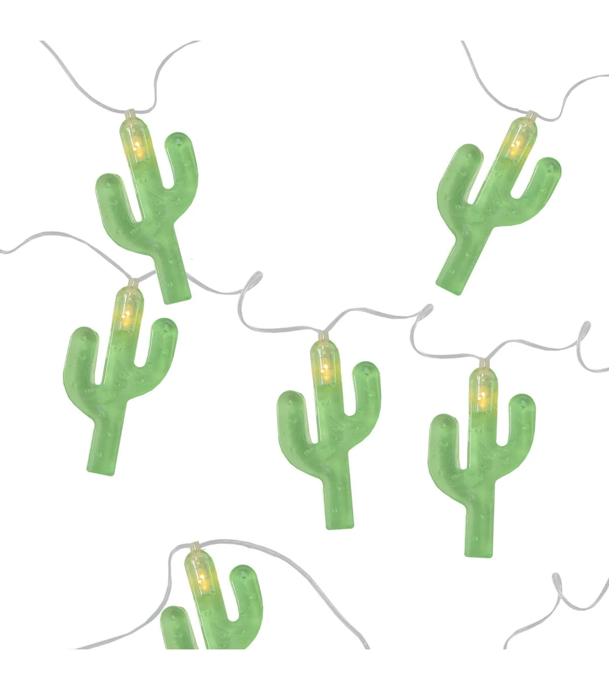 Add a Southwestern feel to your Mexican fiesta or summer party with our string of cactus lights. They bring a touch of the desert to your decor. These LED lights are much more energy-efficient and long-lasting. They operate on 2 AA size batteries efficiently! Product Features: Color: warm white bulbs / clear wire 'Warm white' also known as 'warm clear' has a soft natural incandescent glow similar to candlelight Cactus shaped light covers Number of bulbs on string: 10 Bulb size: concave wide angle Spacing between each bulb: 6' Lighted length: 4.5' Total length: 5.5' 12' lead cord Additional Product Features: LED lights use 90% less energy Durable non-glass replaceable bulbs Cool to the touch Recommended for indoor use only Non-replaceable bulbs Requires 2 'AA' size batteries (not included) Convenient on/off switch on battery pack
