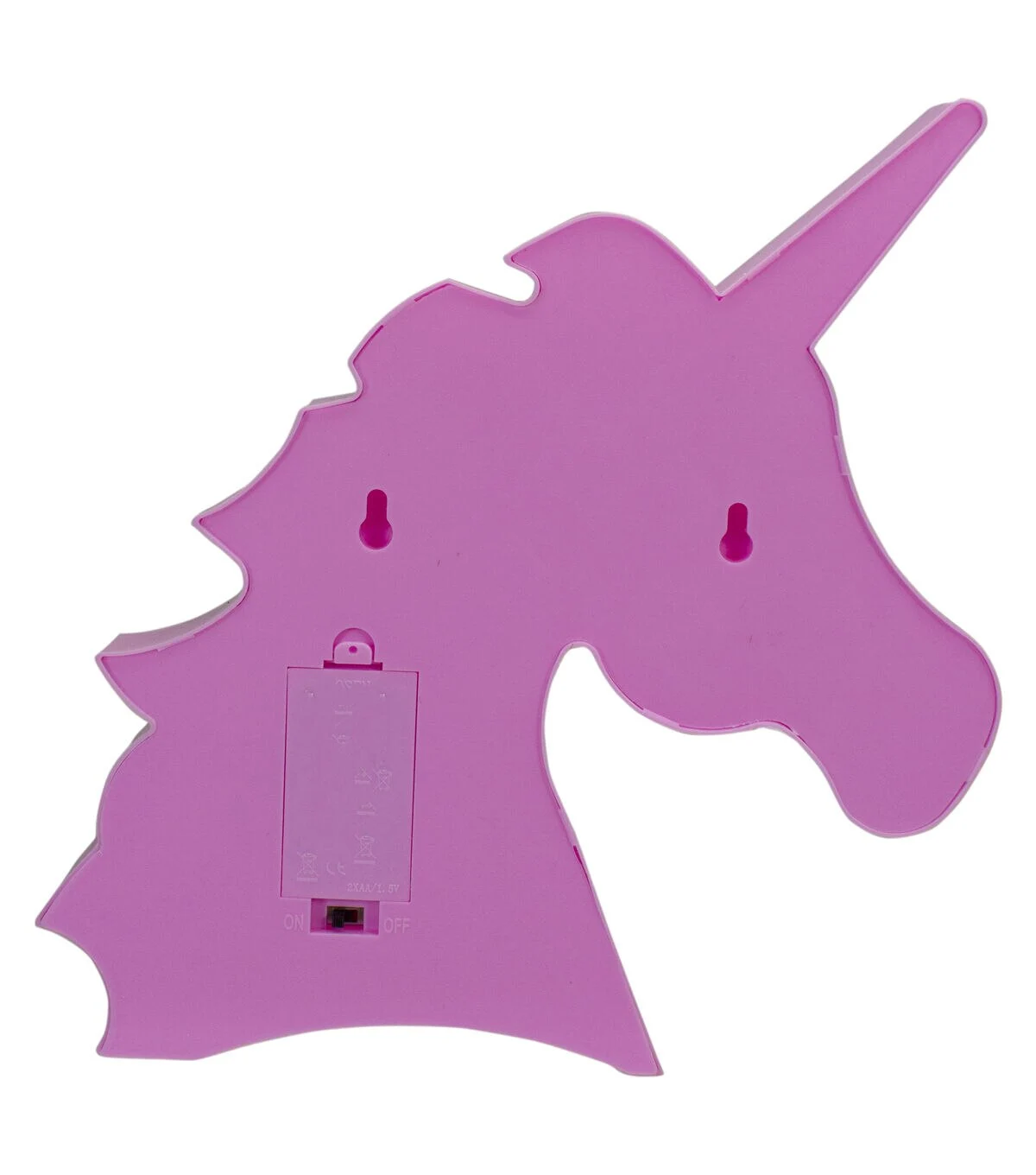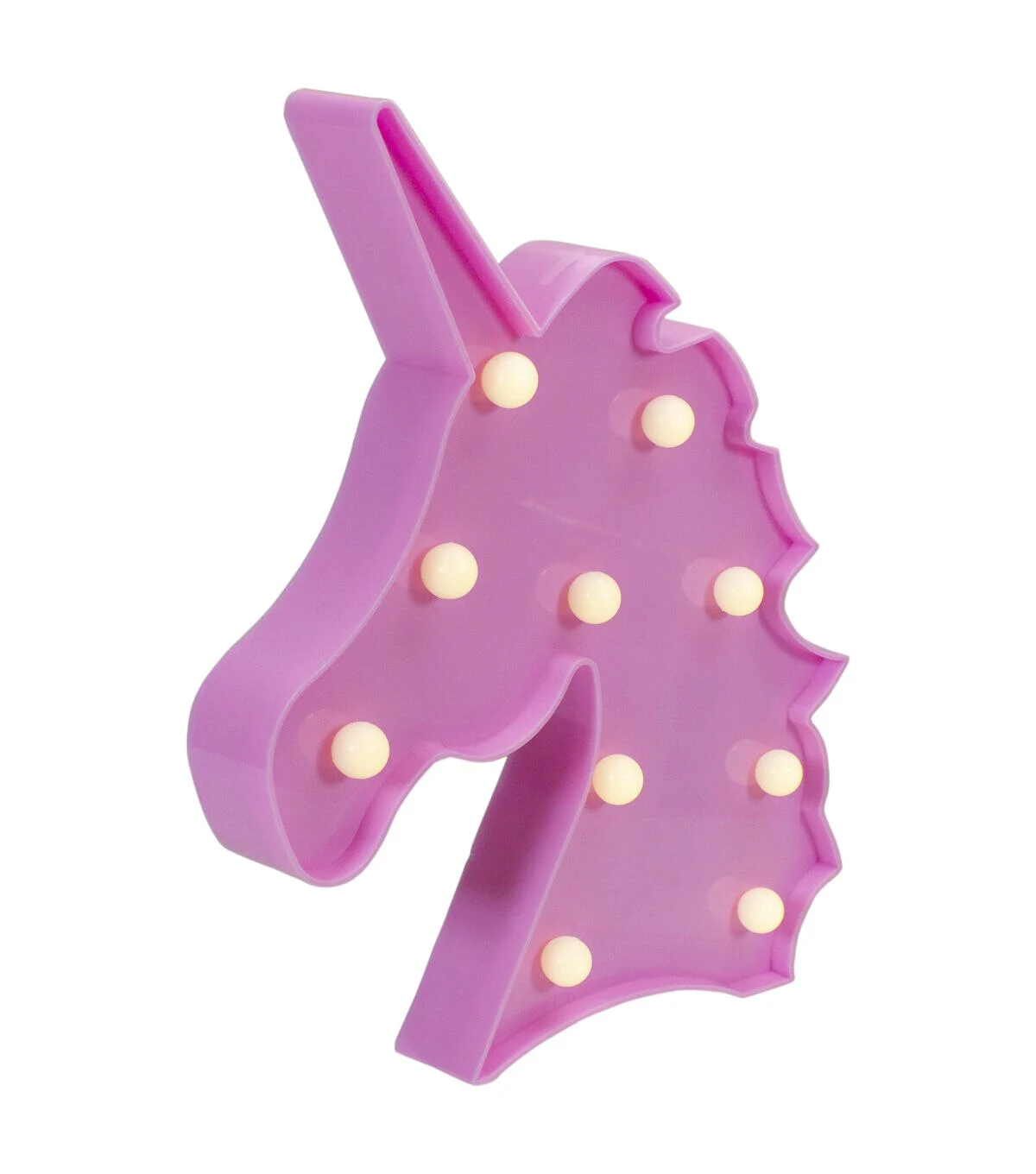 Light up your desk mantle or wall with this fun magical unicorn marquee sign. The sign is lined with warm white lights that give off a soft glow. Perfect as a night light for the little lunar lover in your life! Product Features: Illuminated by LED lights Color: warm white bulbs One-sided design LED lights use up to 80% less energy Bulbs stay cool to the touch Requires 2 'AA' size batteries (not included) Convenient on/off switch on the back Comes ready-to-hang with 2 keyhole hooks on the back Can be used on a flat surface Recommended for indoor decorative use only Dimensions: 10'H x 9'W x 1.25'D Material(s): plastic