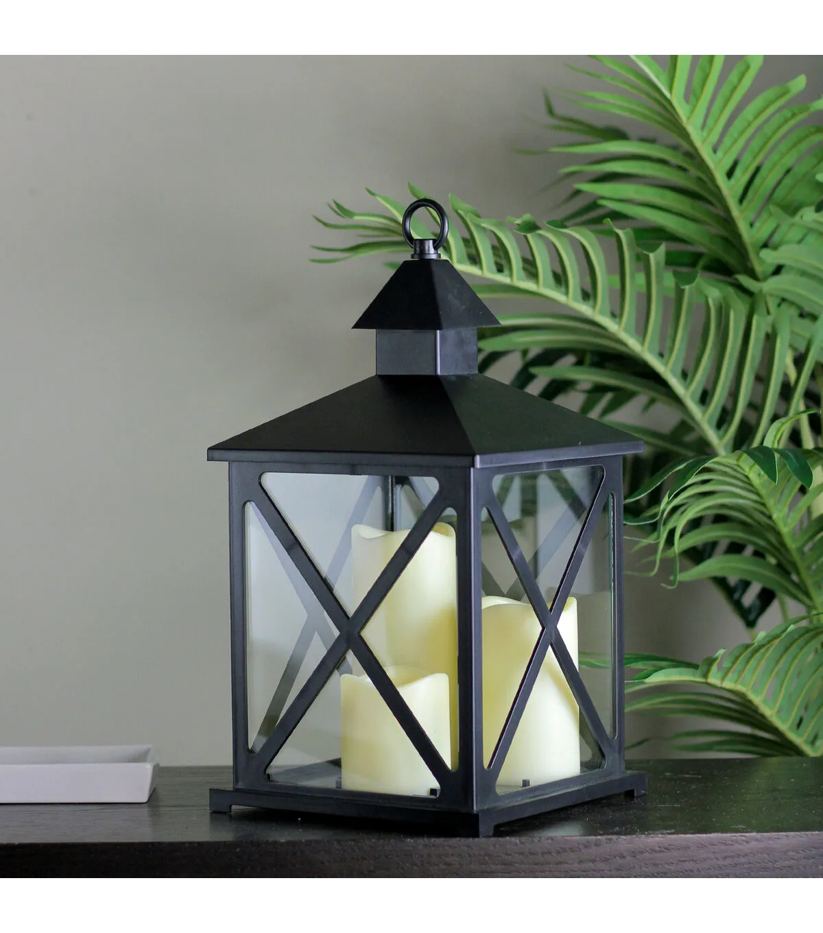 Light up your Summer with this candle lantern. Perfect addition to any evening party or for an romance ambience with your loved one. This stylish lantern will be be the ideal addition to your decor year round. Features a hook for hanging or carrying Lantern is black with X design on panels Includes 3 LED flameless pillar candles On/off switch on bottom on lantern Uses 2 'AAA' batteries - not included Perfect for hanging in the garden or placing on a table top Indoor/outdoor use - if using outdoors it is recommended to keep in a covered area Dimensions: Lantern: 12.5'H x 7.5'W x 7.5'D Candles: Small: 2.75' high x 2.5' diameter Medium: 4' high x 2.5' diameter Large: 6' high x 2.5' diameter Material(s): plastic