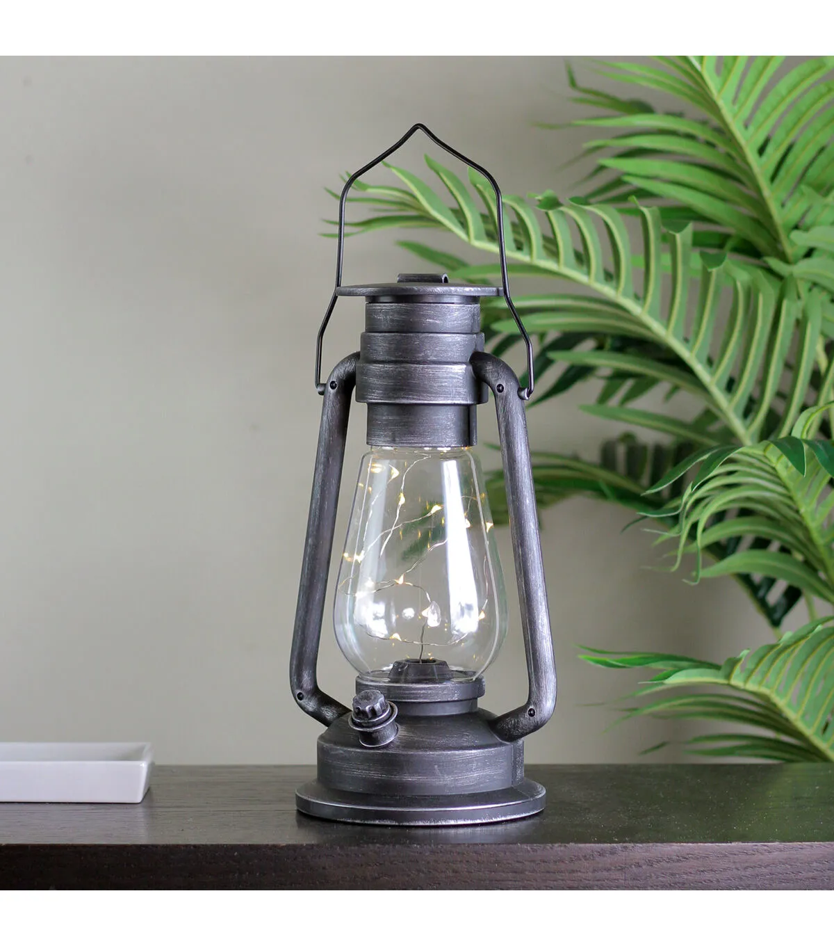 Light up your Summer with this lantern. Perfect addition to any evening party or for an romance ambience with your loved one. This stylish lantern will be be the ideal addition to your decor year round. Features a large handle for carrying and hanging Includes 20 count white micro lights inside Unique brushed silver coloring On/off switch on bottom on lantern Faux rotary knob on front Uses 3 'AAA' batteries - not included Perfect for hanging in the garden or placing on a table top Indoor/outdoor use - if using outdoors it is recommended to keep in a covered area Dimensions: Lantern Without handle: 12'H x 7'W x 5.5'D With handle: 15.5'H x 7'W x 5.5'D Material(s): plastic