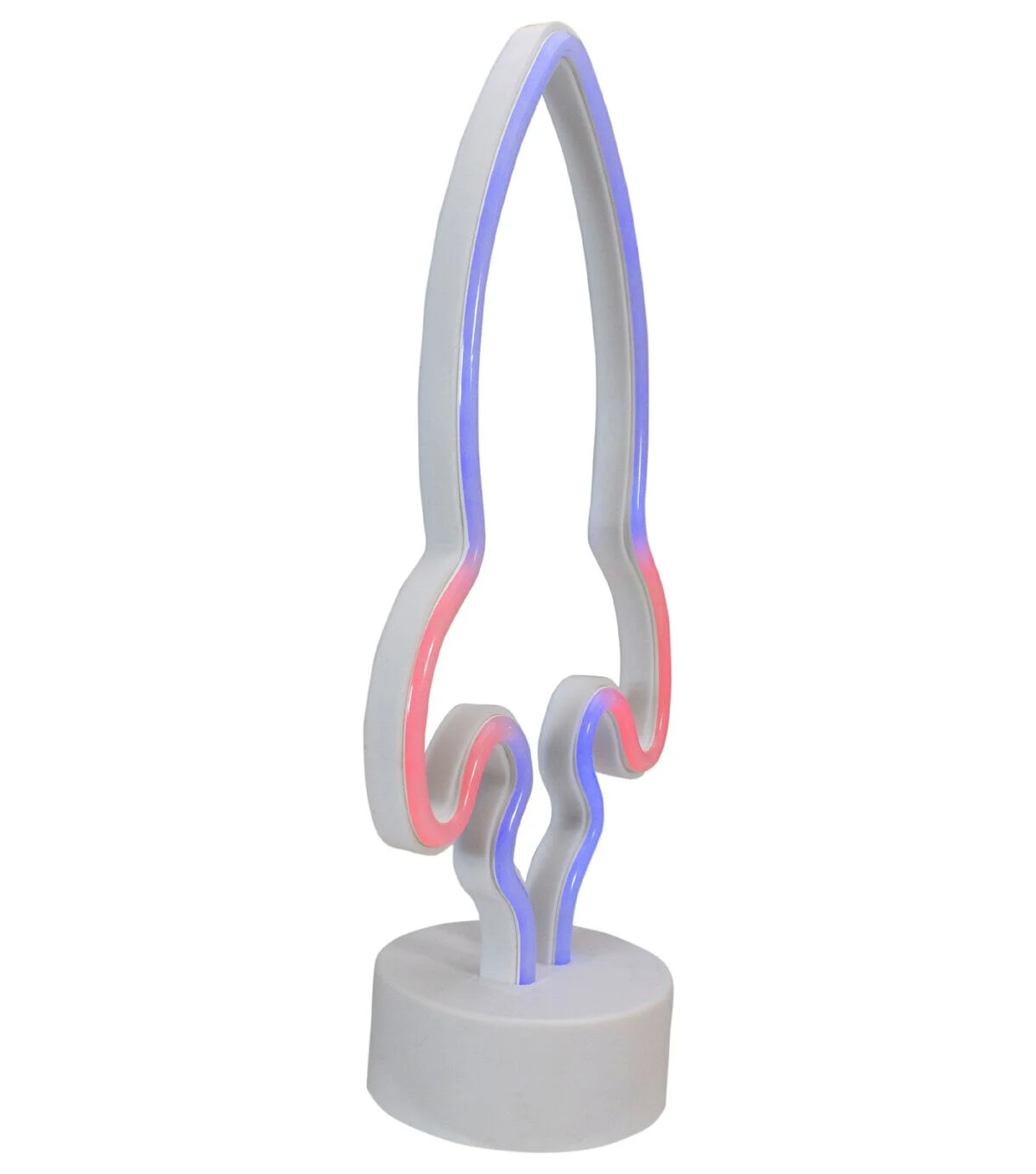 Light up your desk mantle or table with this fun modern rocket neon sign. Perfect as a night light for the little outer space lover in your life! It works with 3 AA size batteries (not included). Product Features: Color: red and blue bulbs One-sided design LED lights use up to 80% less energy Super bright vibrant bulbs Bulbs stay cool to the touch For indoor use only Requires (3) 'AA' size batteries - not included Comes with detachable base for easy storage Convenient on/off switch at the bottom Dimensions: 9'H x 6'W x .5'D Base dimensions: 3.5' in diameter Material(s): plastic/silicone