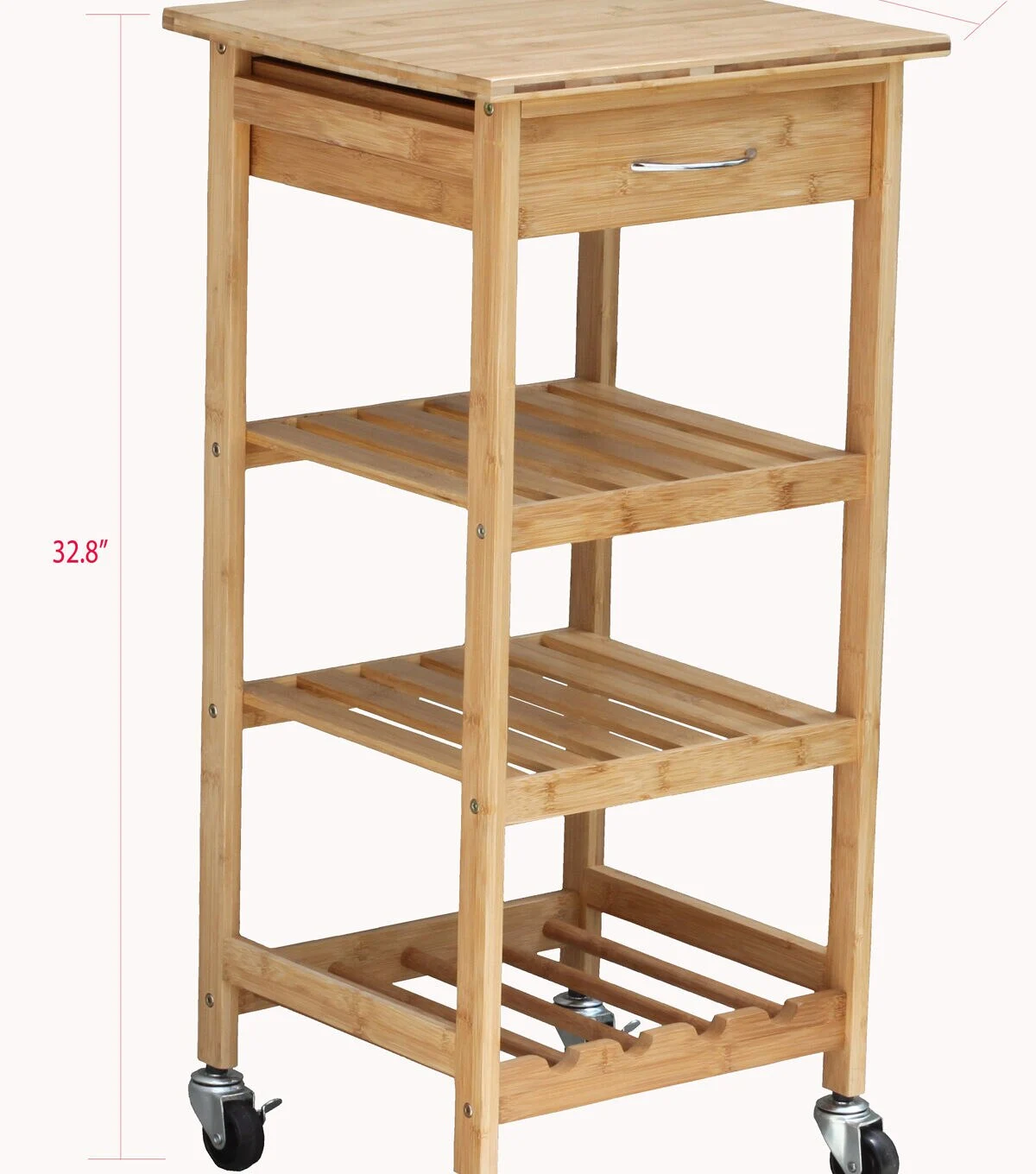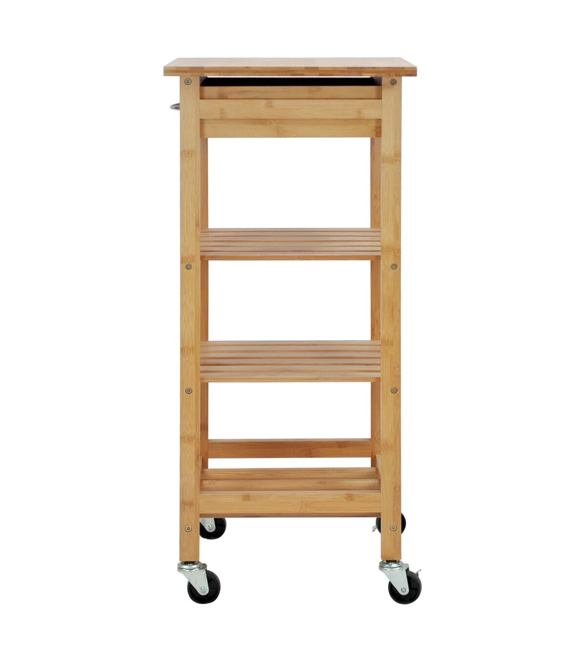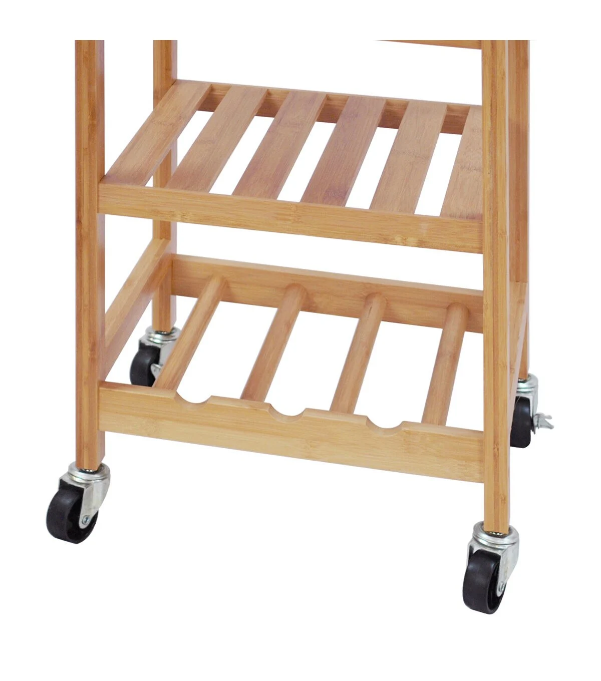 Keep your daily kitchen essentials rolling along next to wherever you are with the Oceanstar Bamboo Kitchen Trolley. It provides both functionality and efficiency to your everyday kitchen tasks. The Bamboo cart is small enough for any kitchen and just big enough for extra storage room. It provides both functionality and simplifies your everyday kitchen tasks. The cart comes with a drawer to keep your utensils, three shelves to hold your kitchen gadgets or small items, the bottom shelf acts as also a wine storage rack as well. The Oceanstar Bamboo Kitchen Trolley is the perfect addition to any kitchen.
