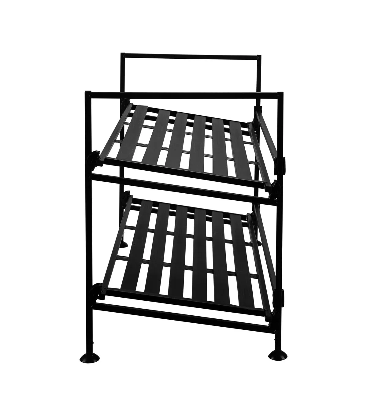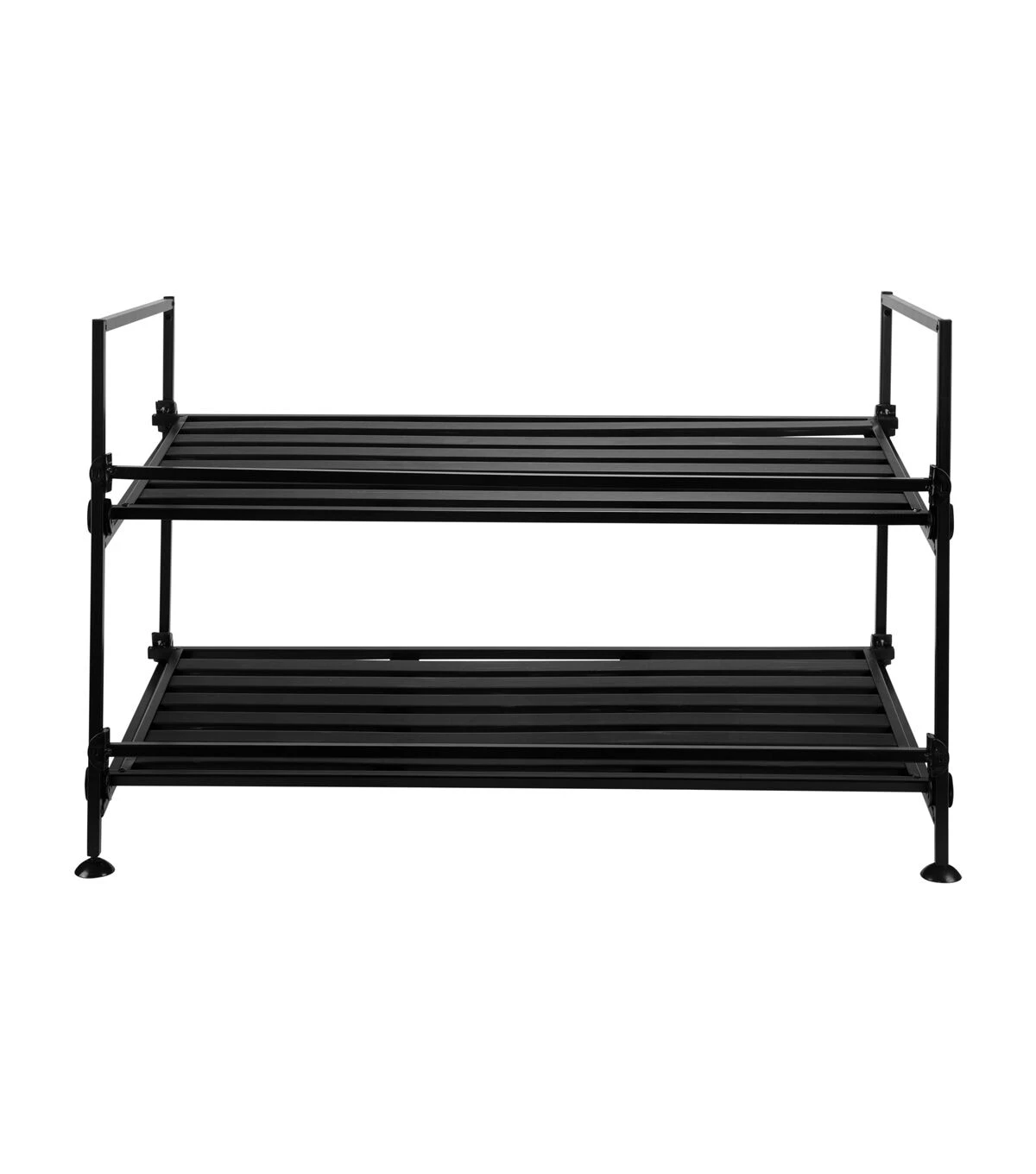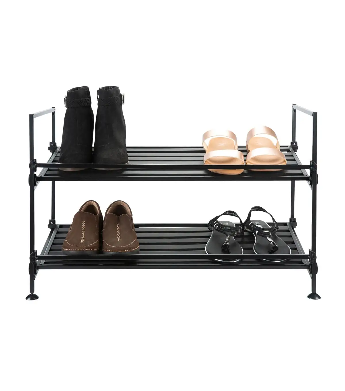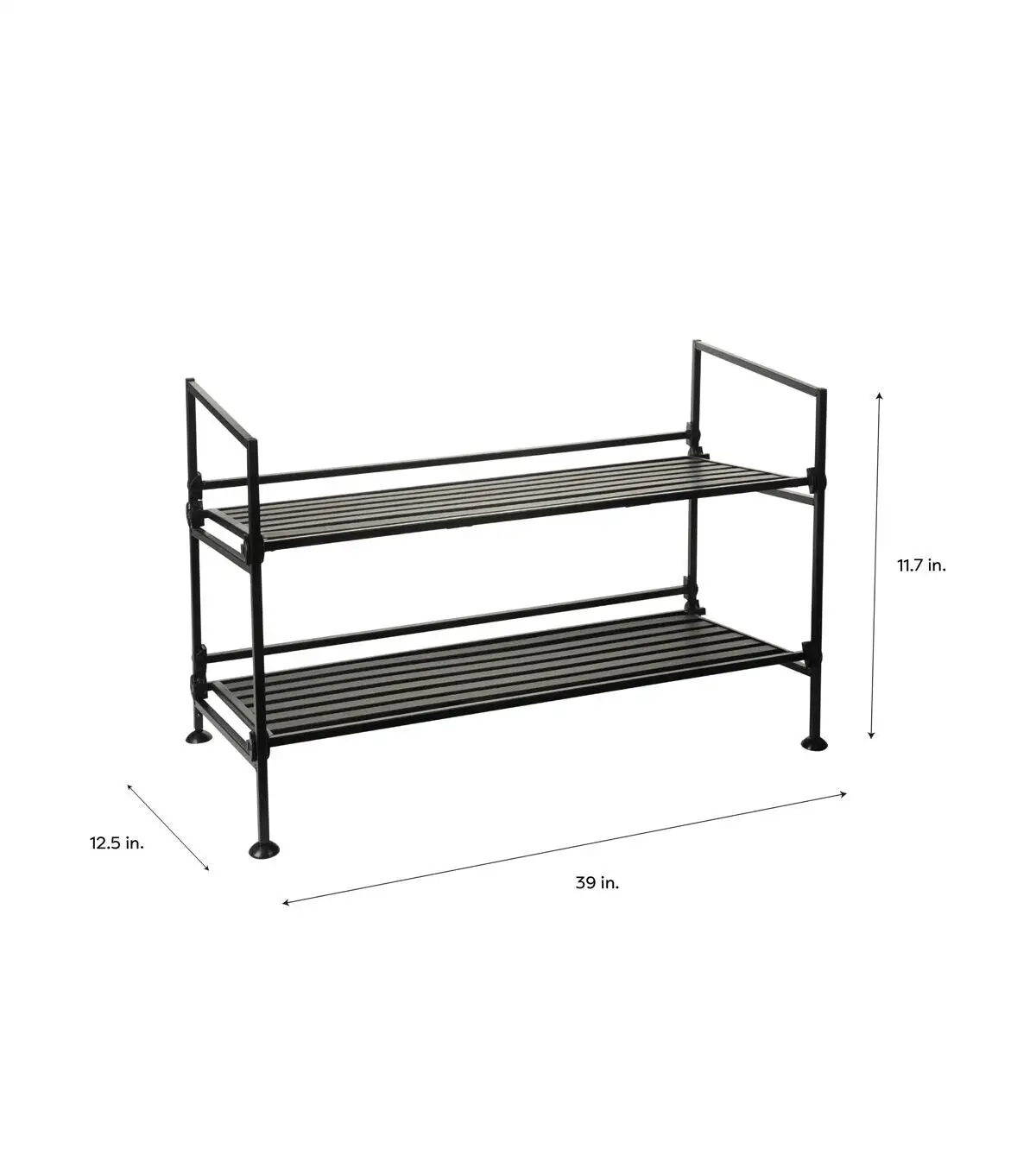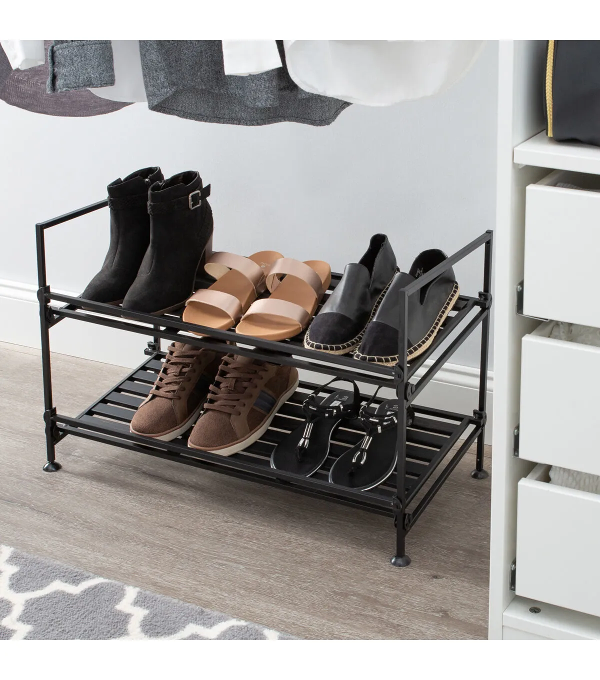 Put this Organize It All 2 Tier Shoe Rack inside or outside of your closet to maximize storage space and keep your shoes organized. Save floor space anywhere you put this. It holds up to 6 pairs of shoes. The racks are tilted with a front stop to prevent shoes from falling out. Put this item in your entryway or bedroom to create a nice place for storage and to keep your shoes organized.