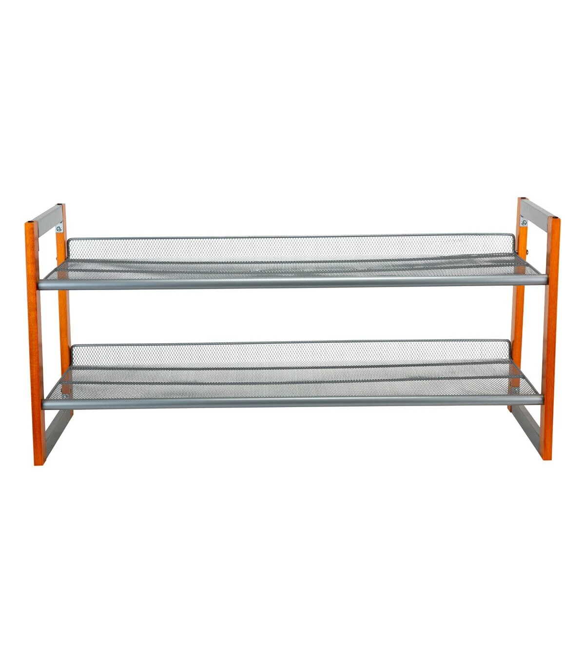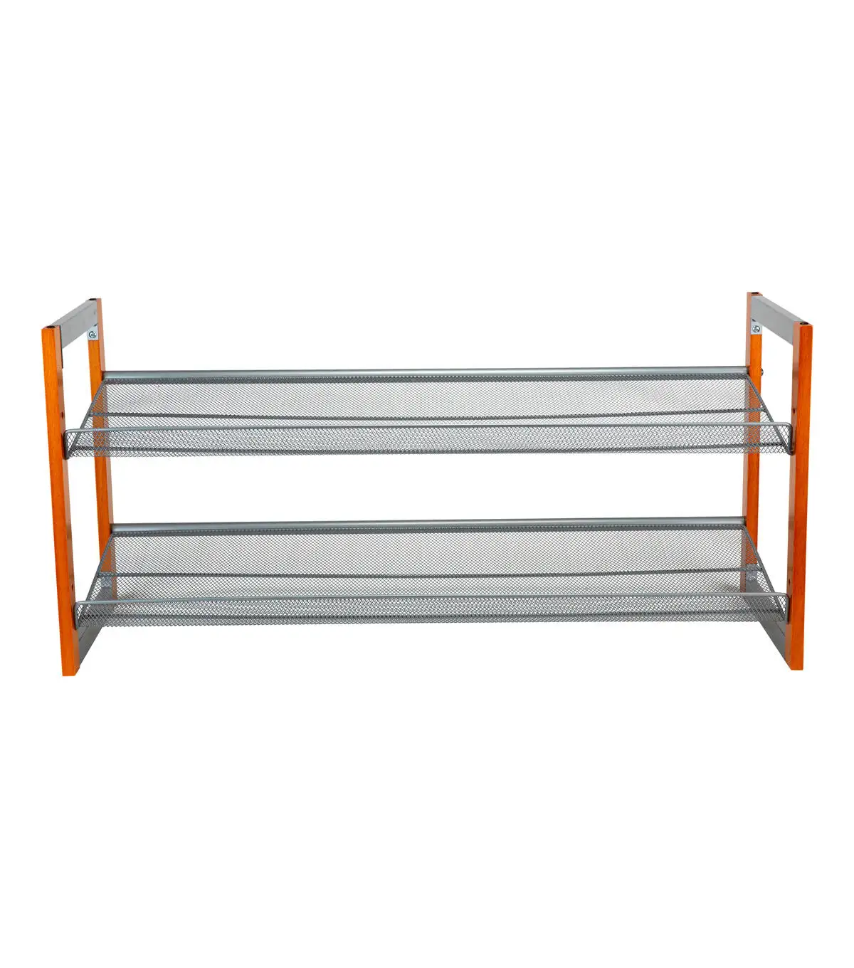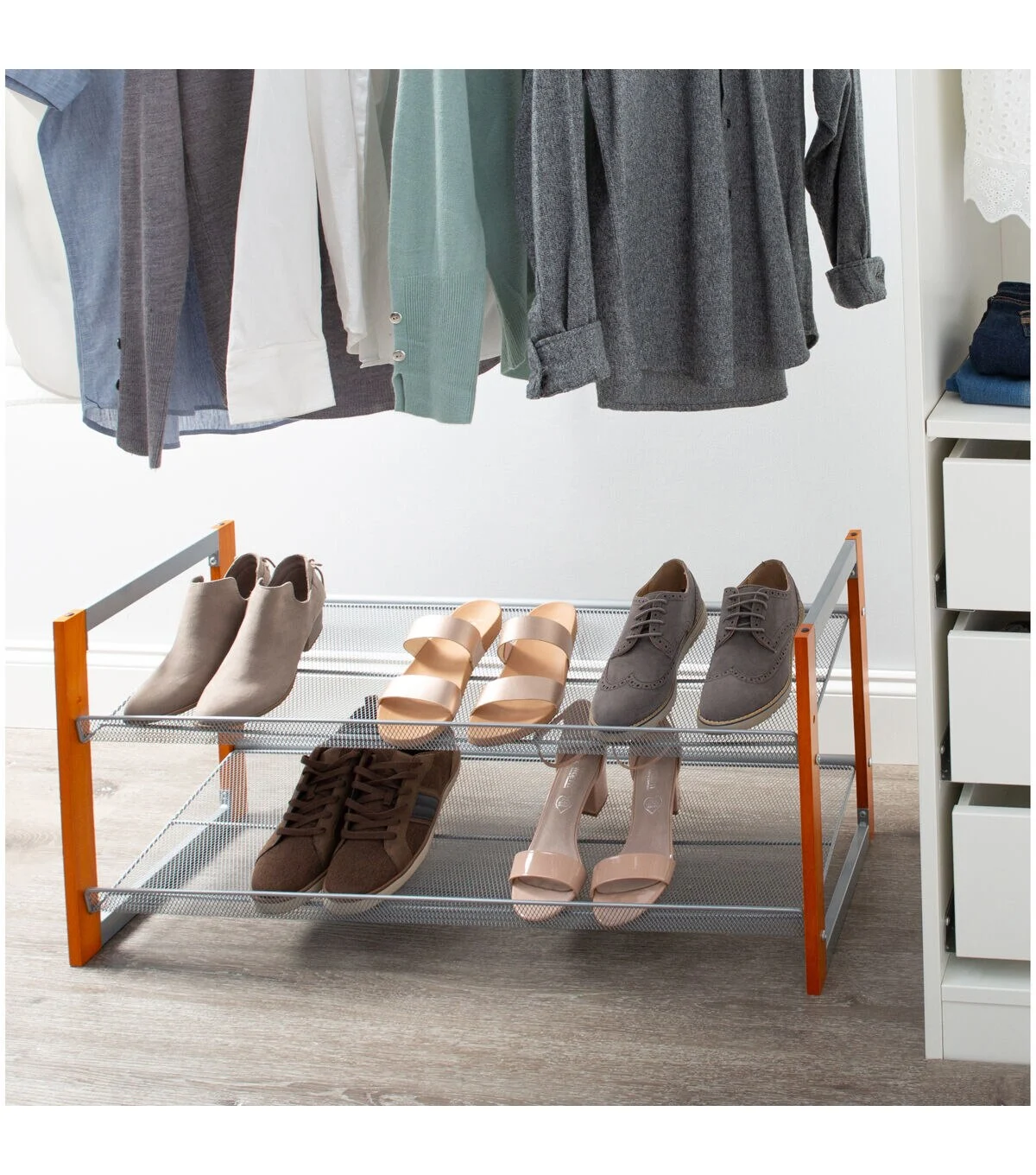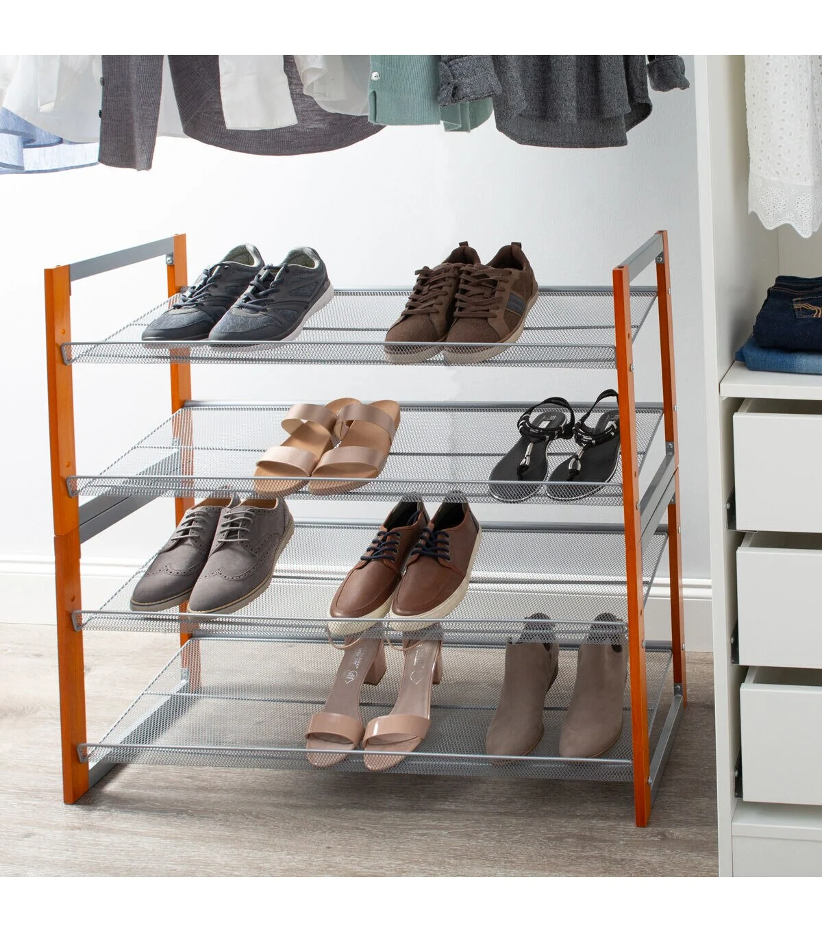 Maximize your storage space by storing your shoes on the Organize It All stackable shoe rack. This item includes two racks that stack on top of one another equaling 4 tiers of shelving. Each shelf holds up to 4 pairs a shoes totaling 16 pairs for the entire shoe rack. Holds all different types of shoes such as boots, sandals, pumps, sneakers and loafers. Great for placing in a closet, entryway or bedroom! The Shelf can be angled or flat .