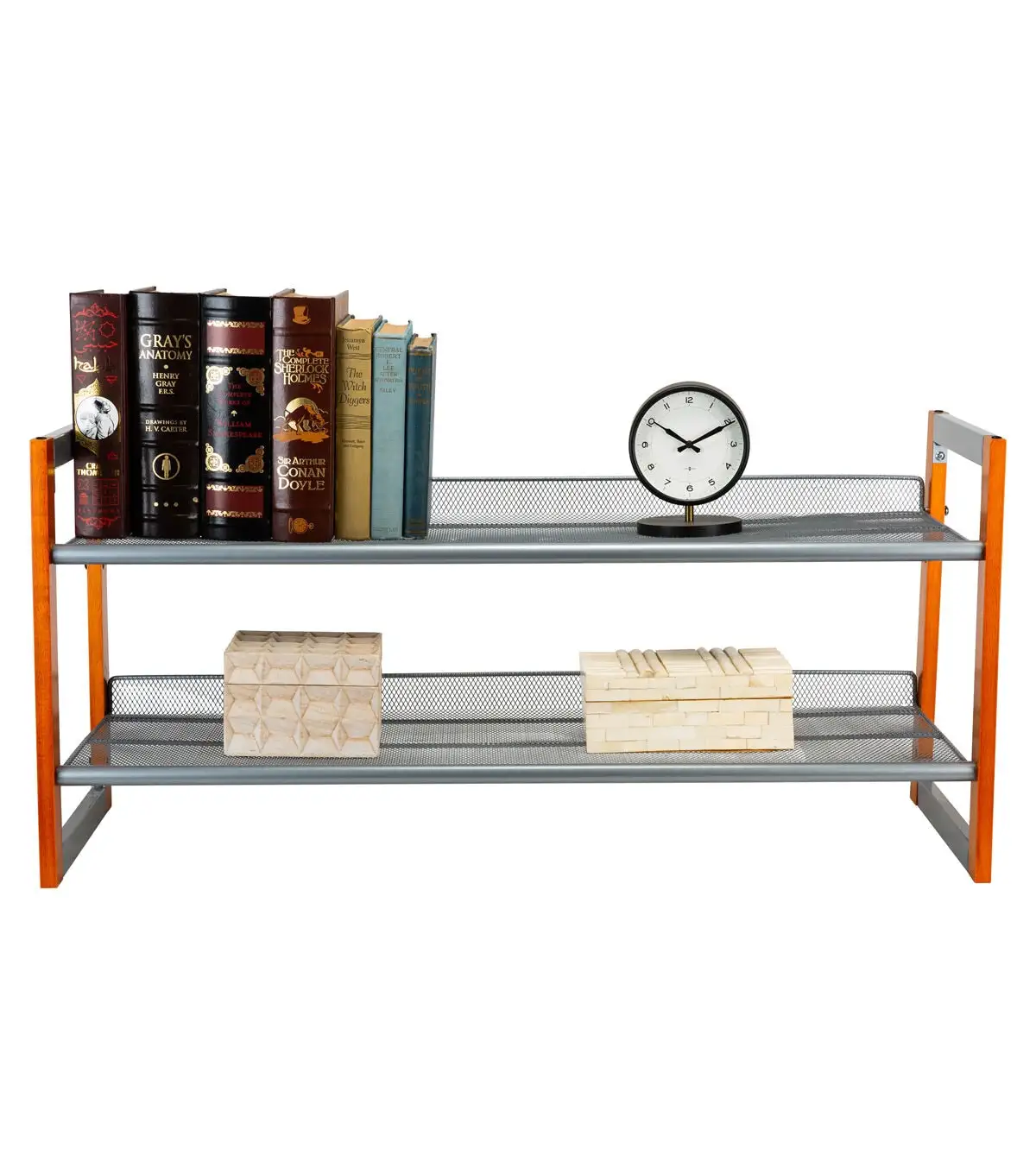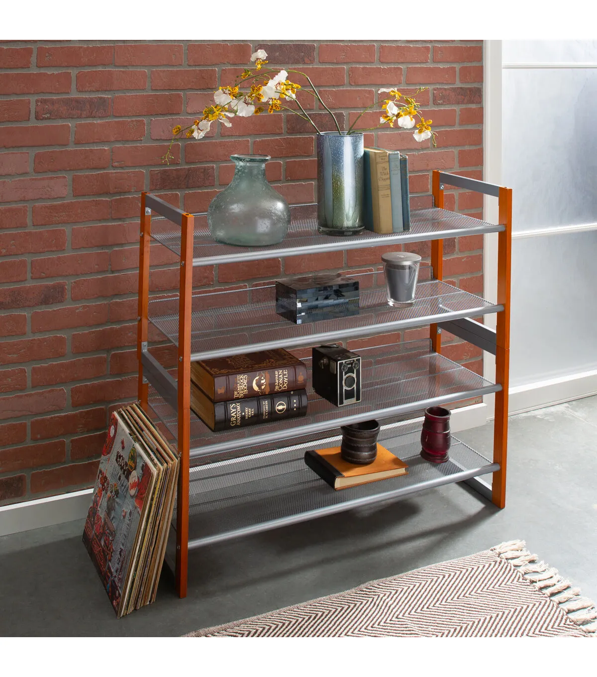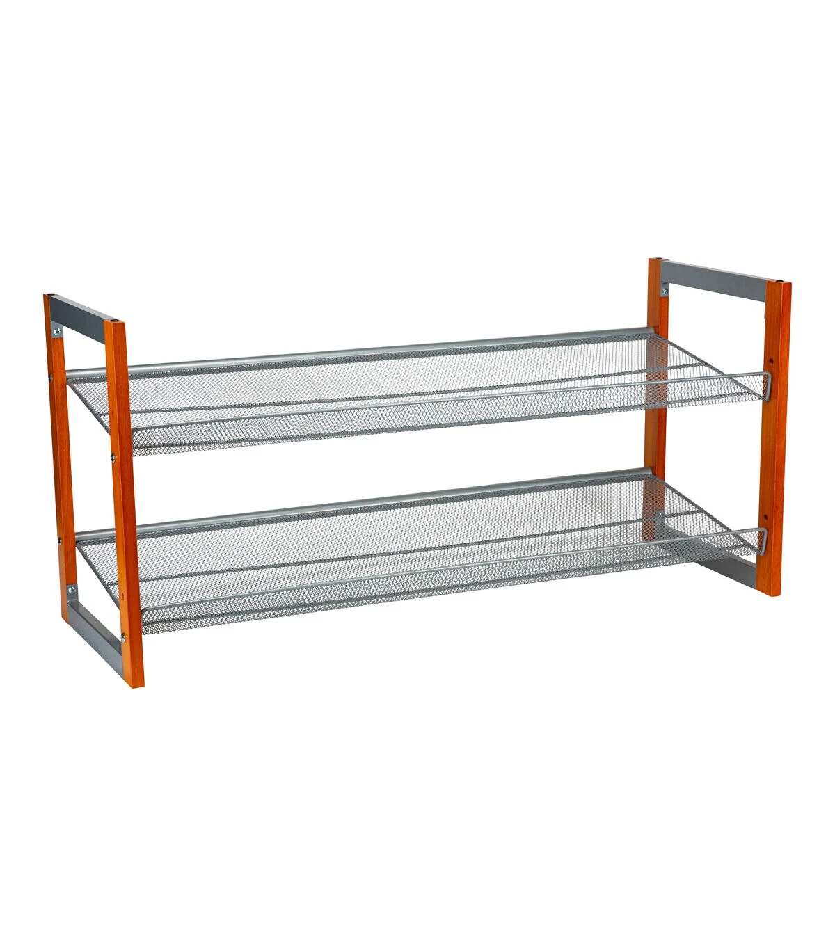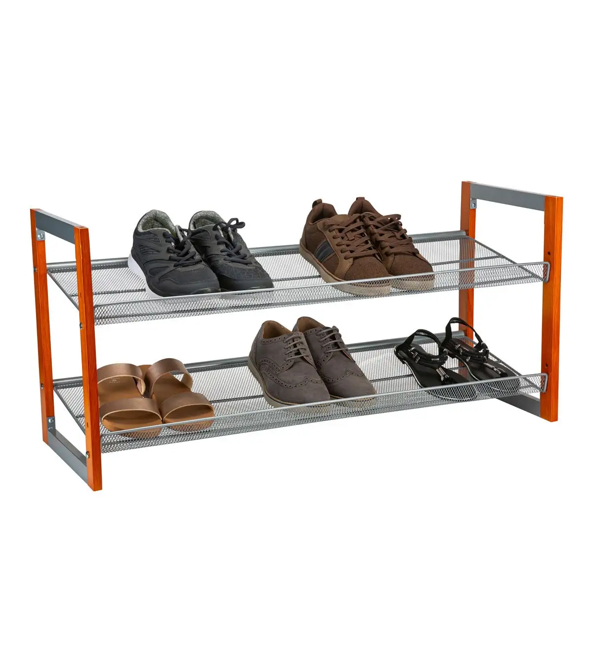 Maximize your storage space by storing your shoes on the Organize It All stackable shoe rack. This item includes two racks that stack on top of one another equaling 4 tiers of shelving. Each shelf holds up to 4 pairs a shoes totaling 16 pairs for the entire shoe rack. Holds all different types of shoes such as boots, sandals, pumps, sneakers and loafers. Great for placing in a closet, entryway or bedroom! The Shelf can be angled or flat .