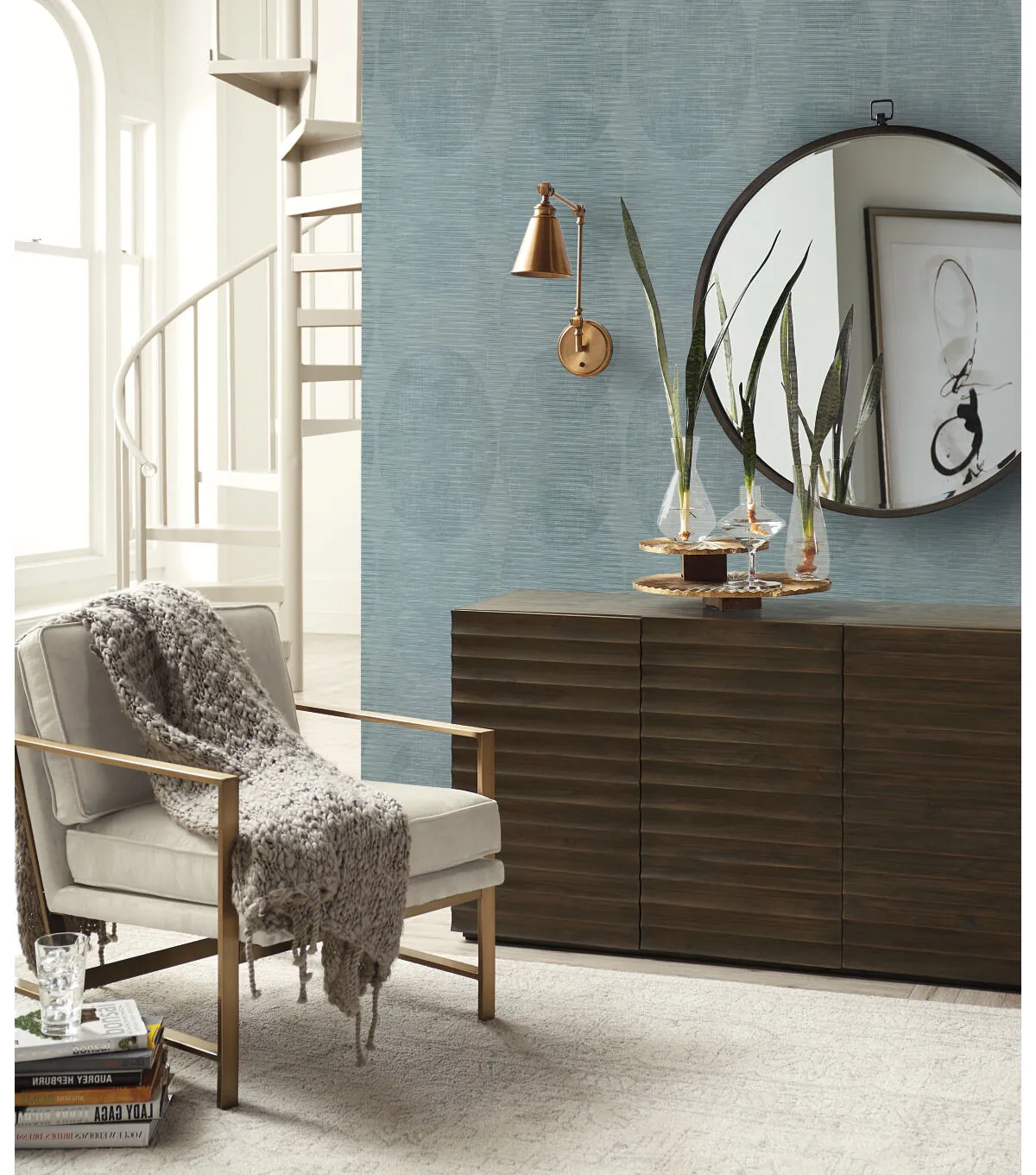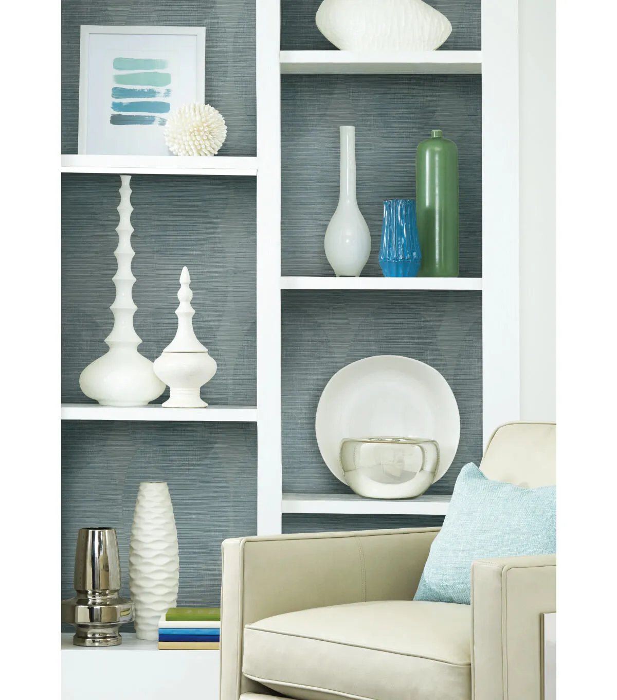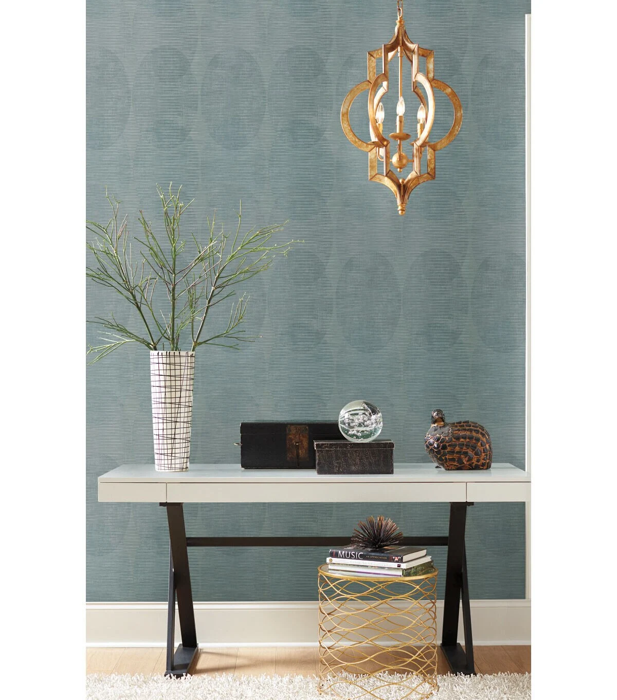 Subtle overlapping ellipticals chain together in vertical links and softly mottled horizontal striations create a contemporary fashion statement in Sahara peel and stick wallpaper by Nikki Chu for RoomMates.
