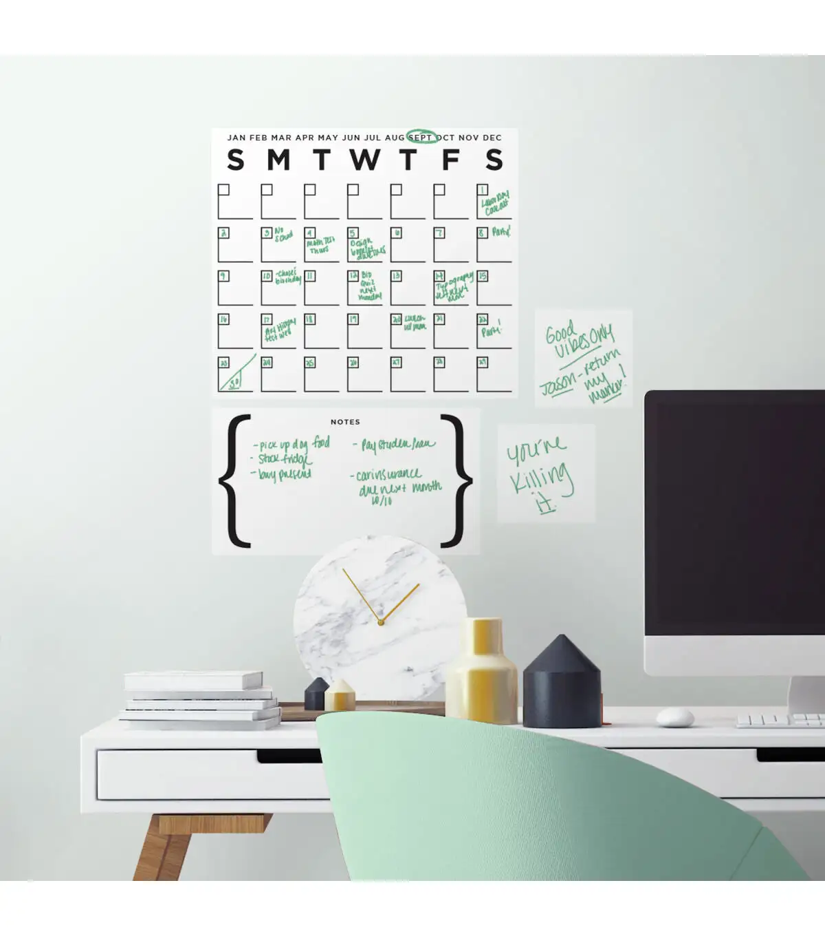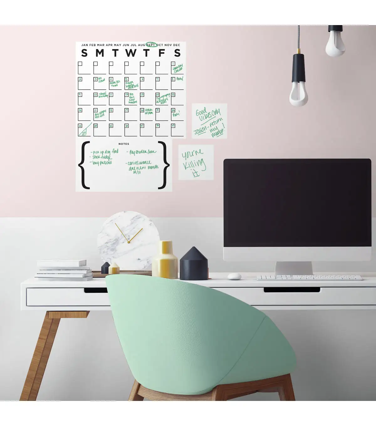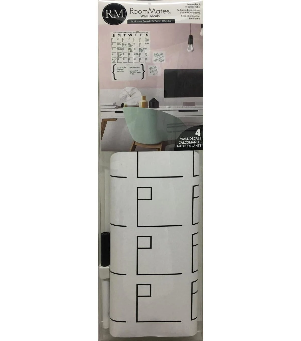 Turn walls to organization tools with Dry Erase Calendar Peel and Stick Wall Decal Set by RoomMates. Complete with 4 decals, this wall sticker set is a fun and creative way to transform any room in seconds. To apply, simply peel and stick decals to any smooth, flat surface. Remove, reposition and reuse as often as needed. Created with high quality vinyl that's made to last, walls stay completely safe, and sticky residue is never left behind. It's fast, fun and affordable wall decor at it's best.