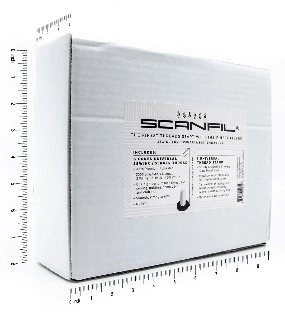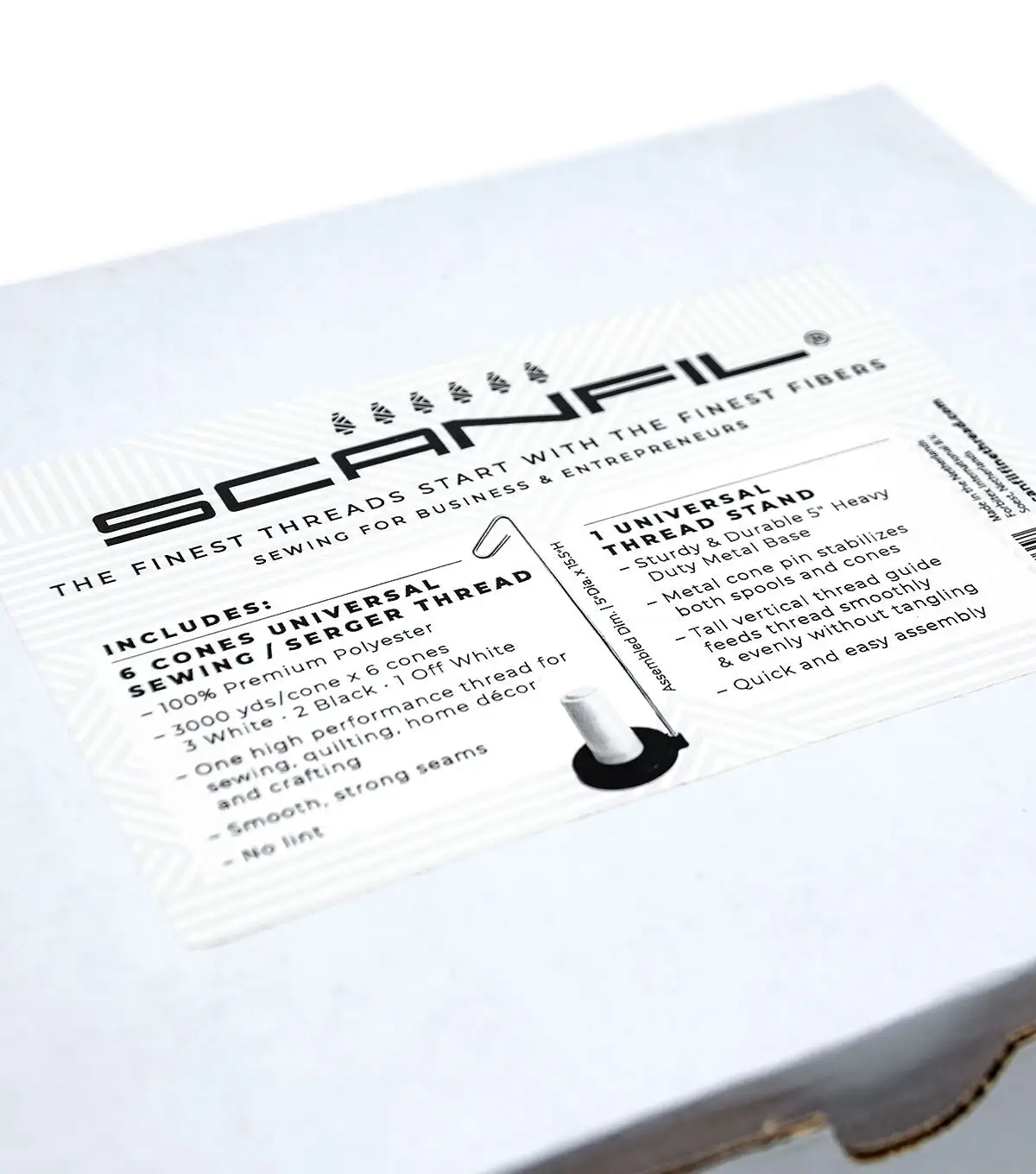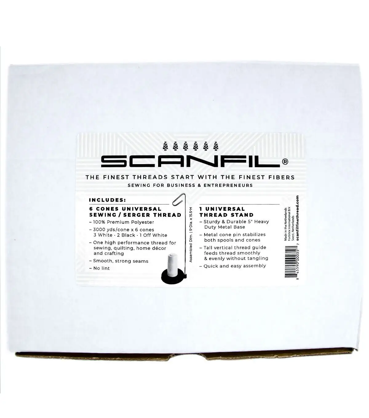 For entrepreneurs and small sewing business owners, SCANFIL Sewing for Business Set is designed to make small production projects more efficient. This Set contains 6 large 3000 yard cones (3 cones White/2 cones Black/1 cone Off White) and a durable metal thread cone stand to feed the thread smoothly through your machine. The Universal High Tenacity Polyester thread makes great stitches using an Overlocking or Chain Stitch sewing machine so only one thread type needed. The 3000 yards per cone is more economical and reduces the number of thread changes, freeing up time and money for other business matters.