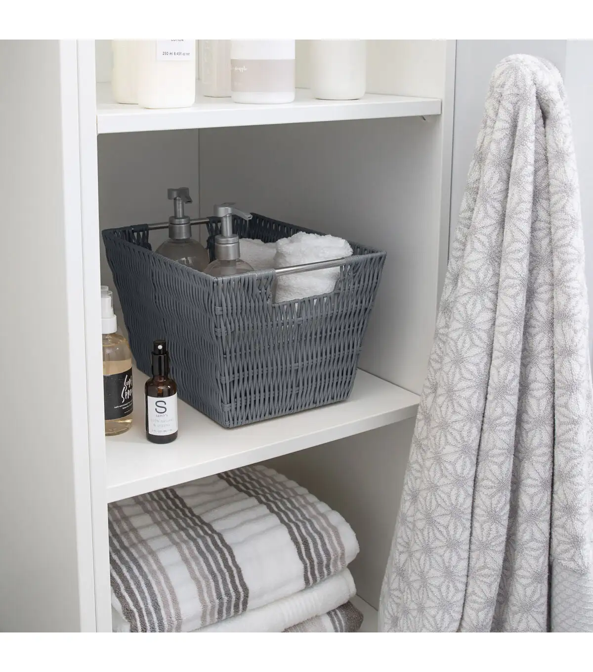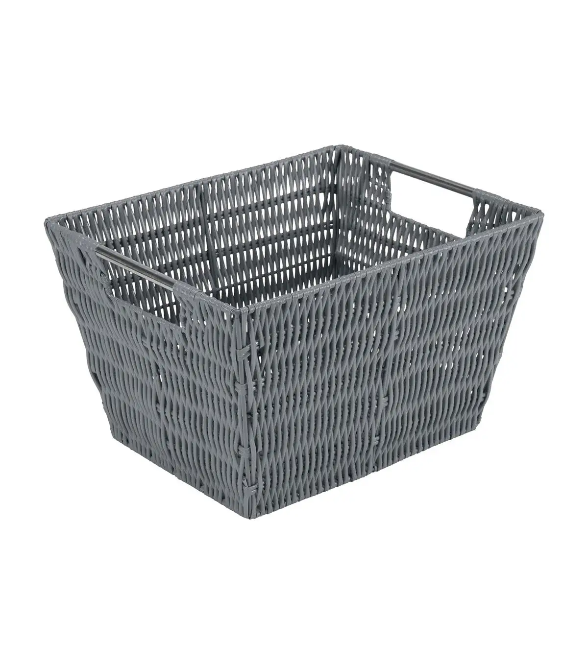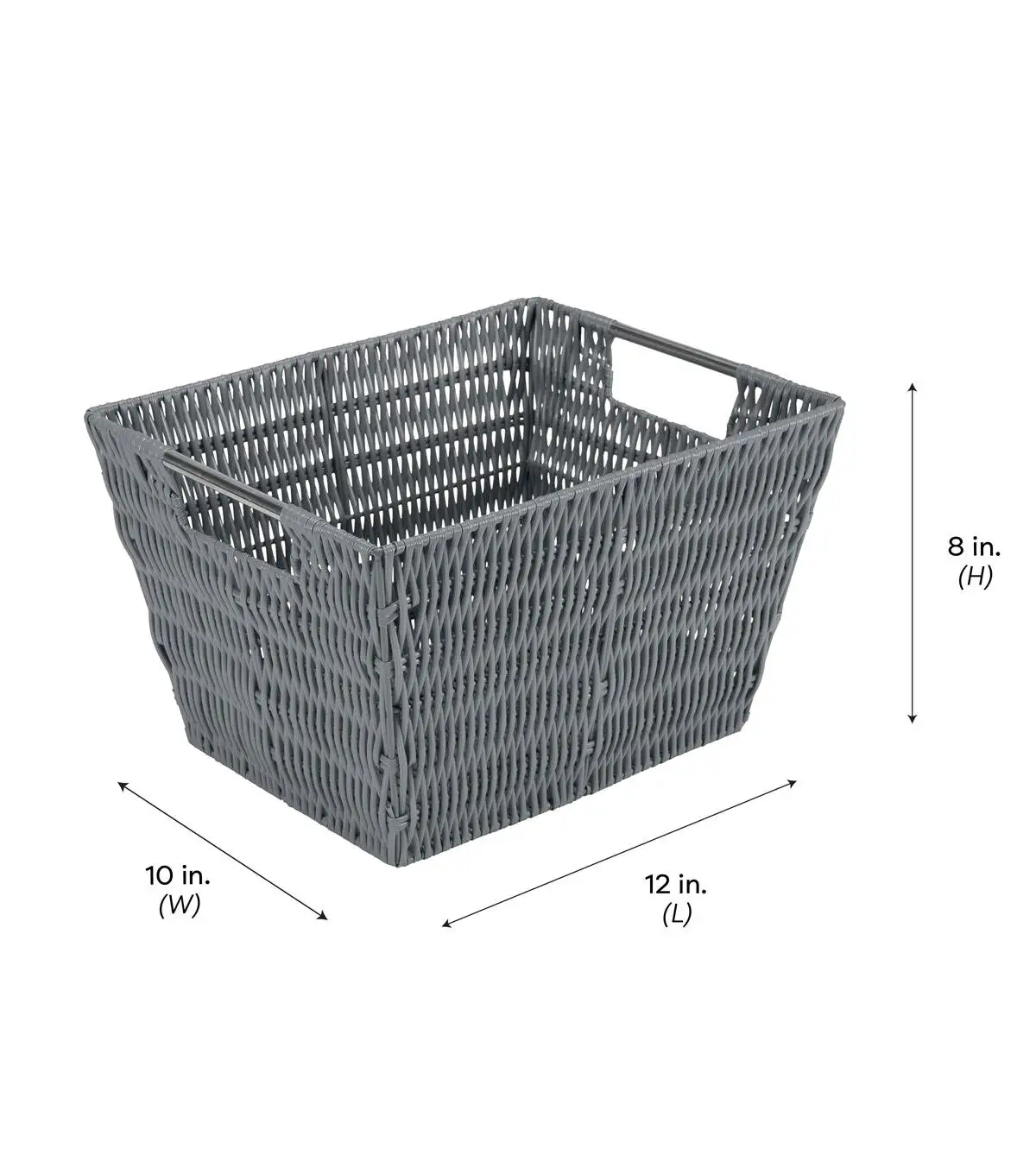 Organize and create storage in your home with the Simplify Rattan Tote Basket Collection. Simplify's Rattan Tote is a PE Basket with an iron frame and 2 sturdy stainless steel carry handles. It is strong anddurableprolonging it's life, and it's lightweight design makes it easy to lift and carry. Fits anyhome decor with it's wide selection of colors. Store your household belongings and organize space with these stylish baskets. Stack them together in a corner of your craft area, home office or Dorm to keep your essentials close at hand in an organized manner.