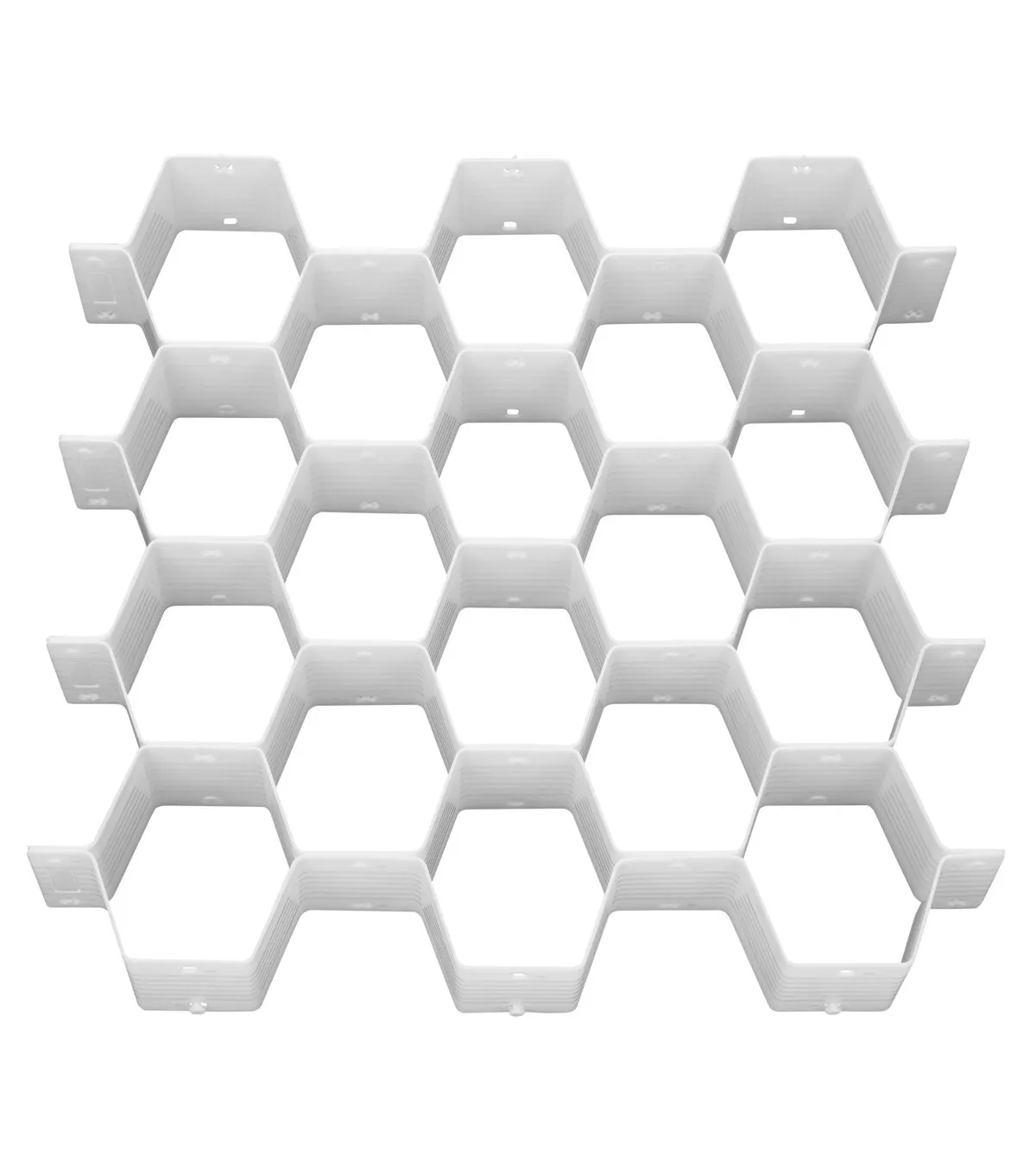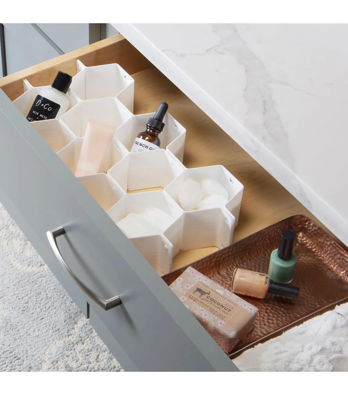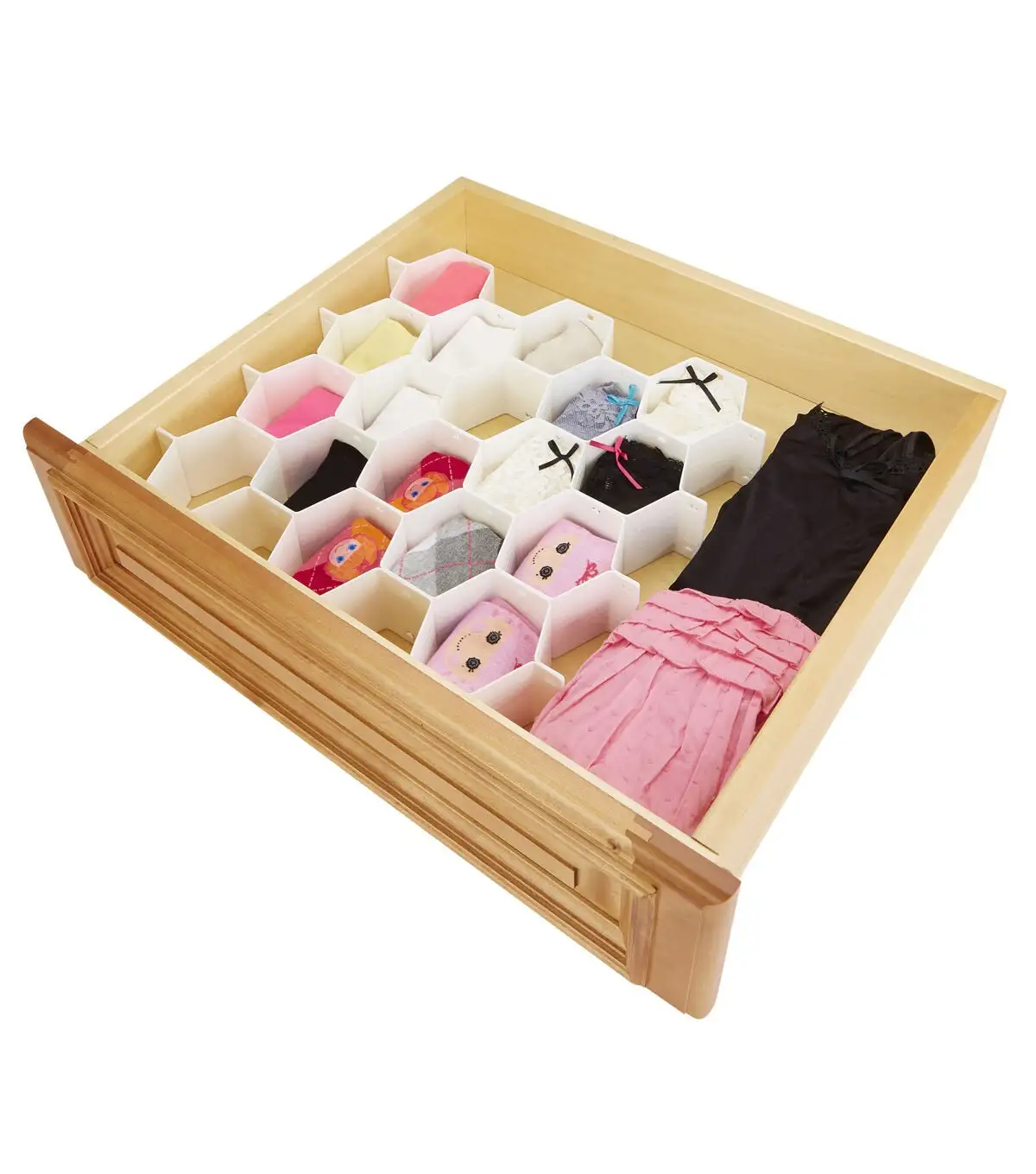 Organize your little items that tend to become messy in your drawer with the Simplify honeycomb drawer organizer. The honeycomb design allows you to create individual compartments within your drawer to maximize space. The 8 piece set easily fits together in your drawer and is perfect for organizing your socks, delicates, jewelry and accessories!