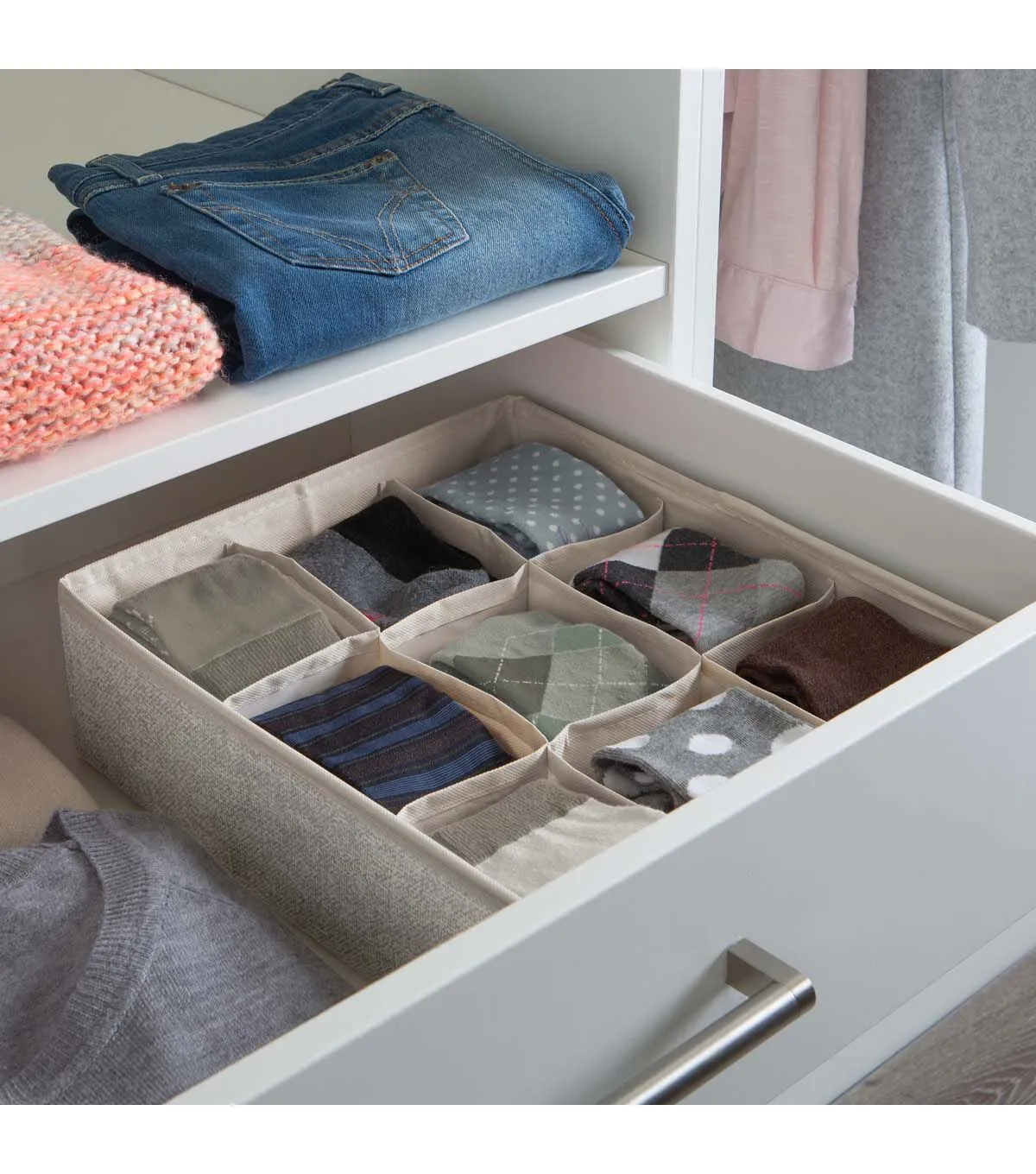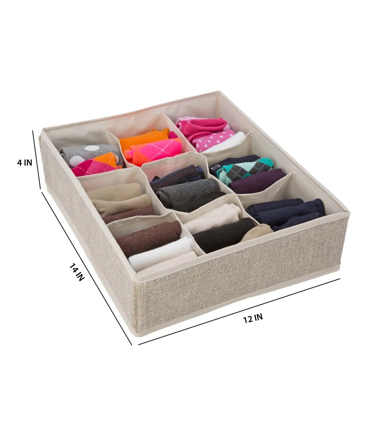 Get your drawers organized with the Simplify 9 compartment drawer organizer. Easily fitting in most standard size drawers, you can keep your smaller garments in order. Great for socks, lingerie, hosiery and accessories. Made of breathable non woven material and open top allows easy access to garments. No more cluttered drawers, simply organize.