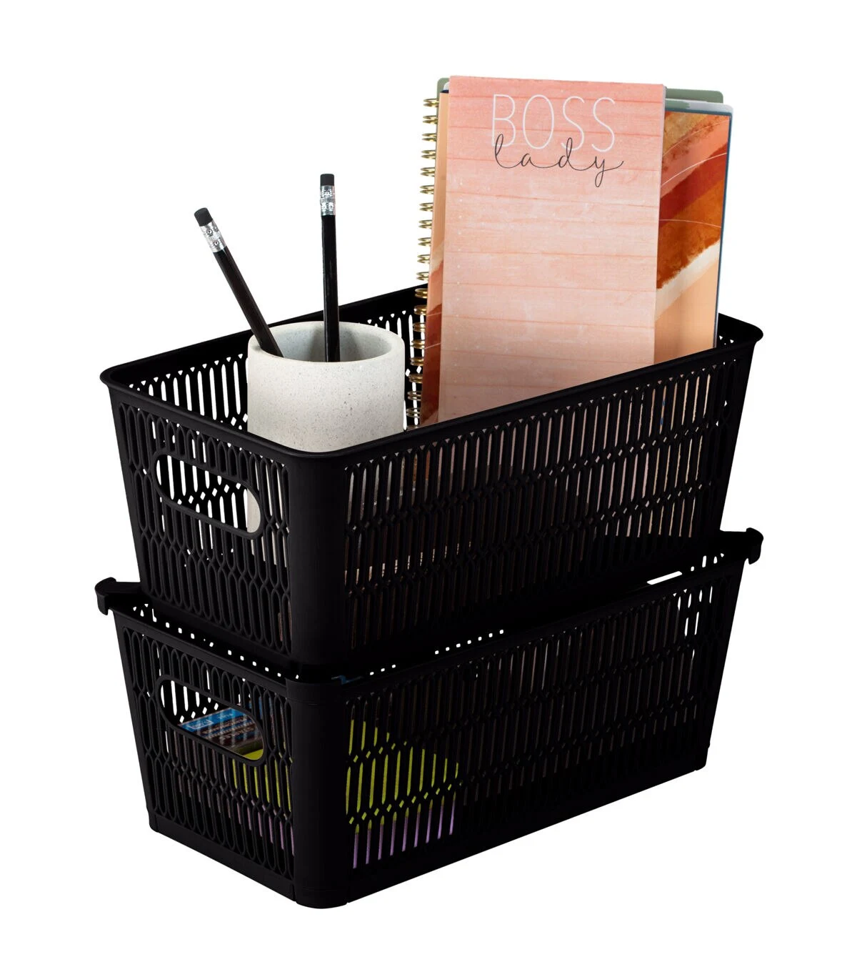 Maximize your storage space with the Simplify 2 Pack Slide 2 Stack It Small Storage Tote Baskets. Created with a patented slide to stack design which provides slide out corner support that allow the totes to be safely stackable. Storage totes hold up to 15lbs while stacked, allowing you to maximize your storage in closets, cabinets, shelves and more. The totes neatly nest inside when not in use. Organizing just became easier with the Simplify slide 2 stack it totes!
