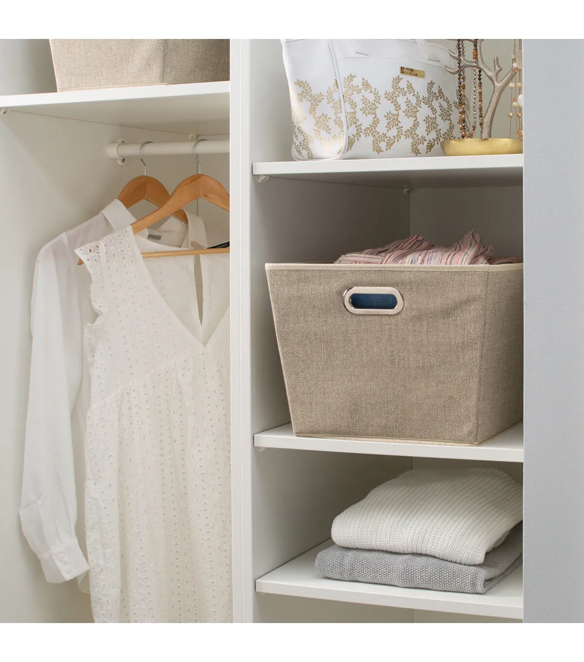 These Simplifystorage totes keep your favorite loose items safely in place. Also, it gives your room a chic look while adding storage space to it. Great for shelving and flat surfaces. Built in handles for easy access, and helps you have your room neatly organized.
