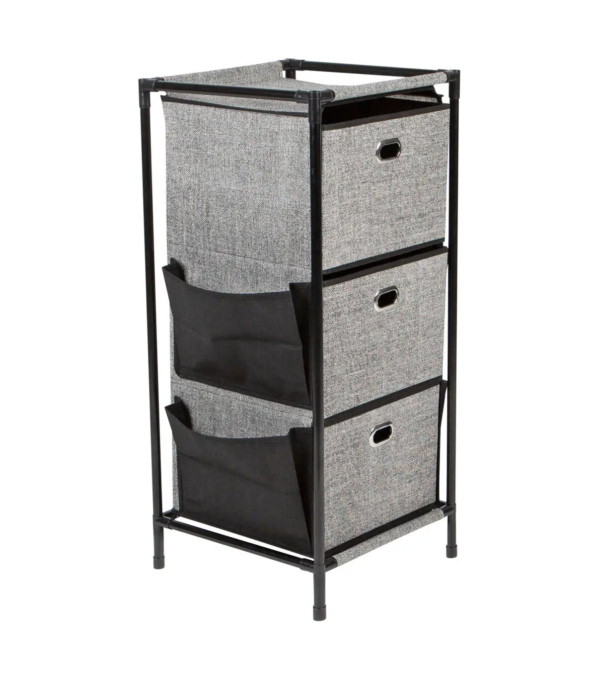 Add extra draw space anywhere with the Simplify Storage Chest. Designed with 3 non-woven drawers and side storage pockets. This is the perfect addition to any room in the house. A durable steel frame allows this item to be sturdy when in use and gives it a stackable design.