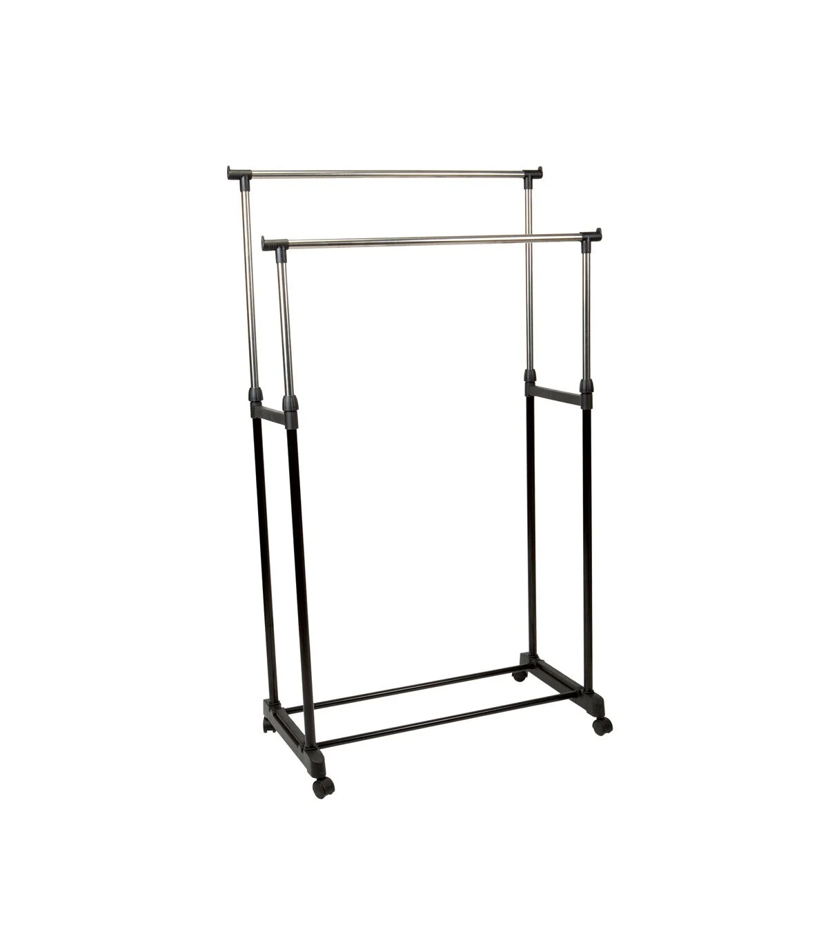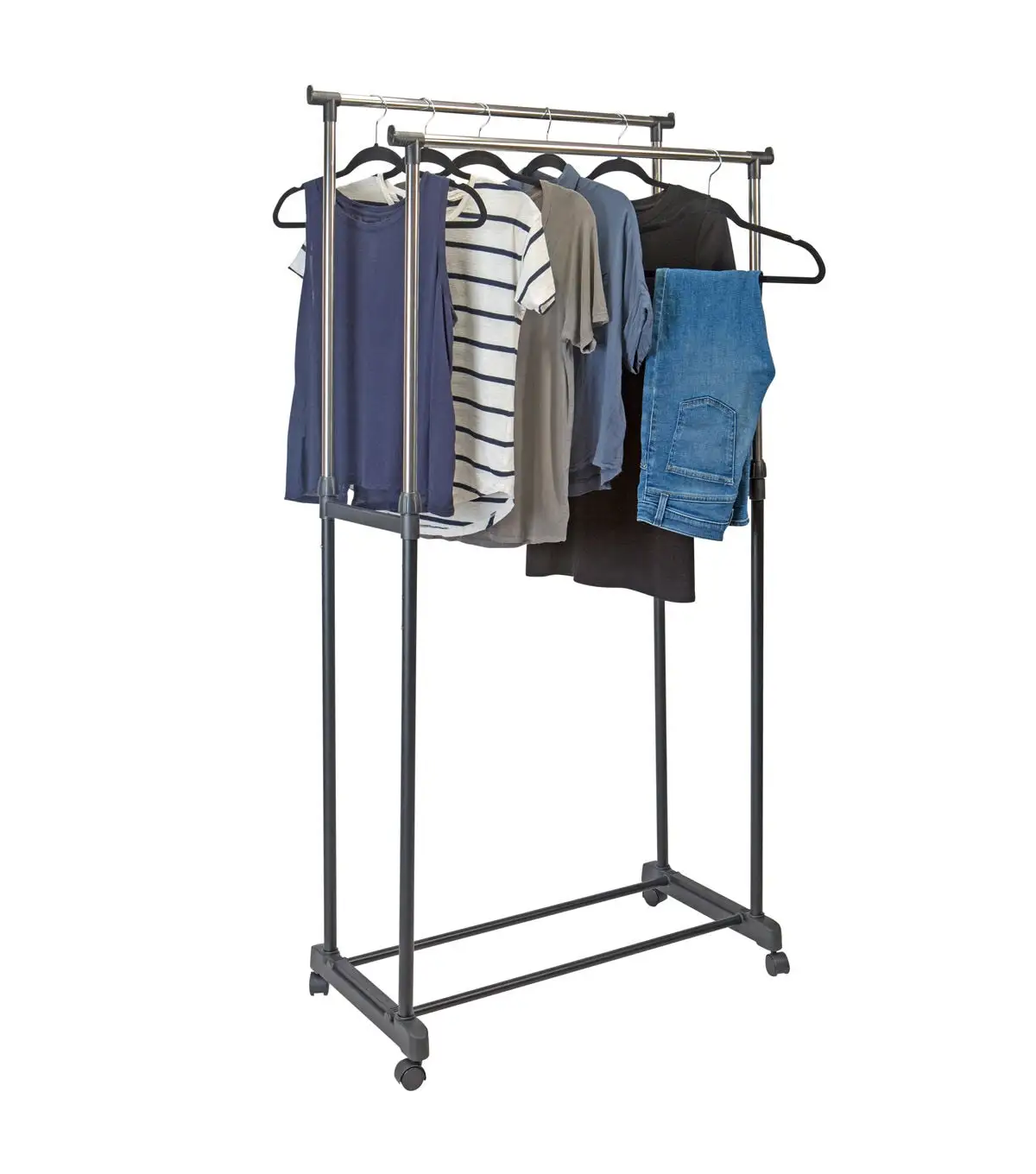 Be able to hang your clothes up wherever you go with the Simplify rolling garment rack. With a double tier rack and an adjustable height of 37'-65' you can fit the rack for your garment needs. A base shelf is included for shoes, handbags and accessories. Conveniently on wheels for easy transportation and complete with a safety lock for the adjustable height. Great for extra hanging space in your home or to bring with you when you are away from home. No tools required to assemble!