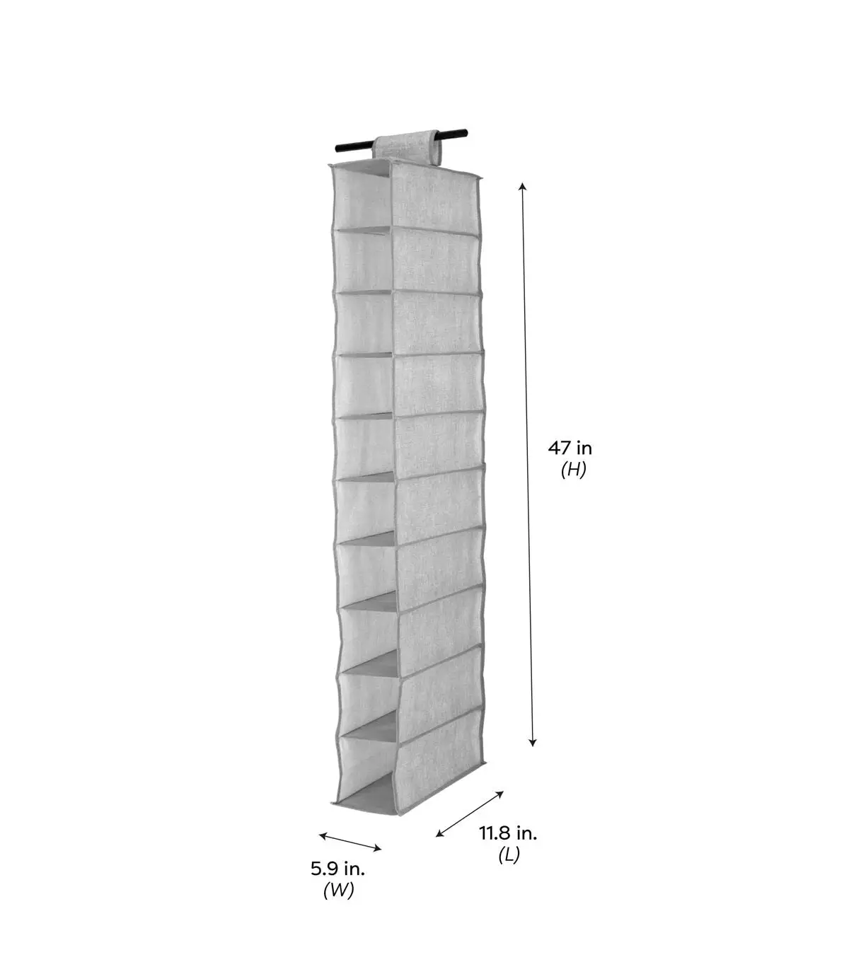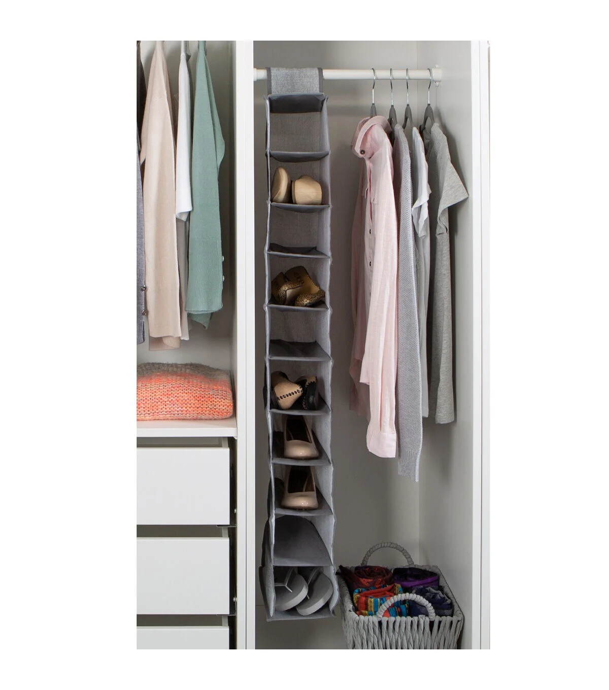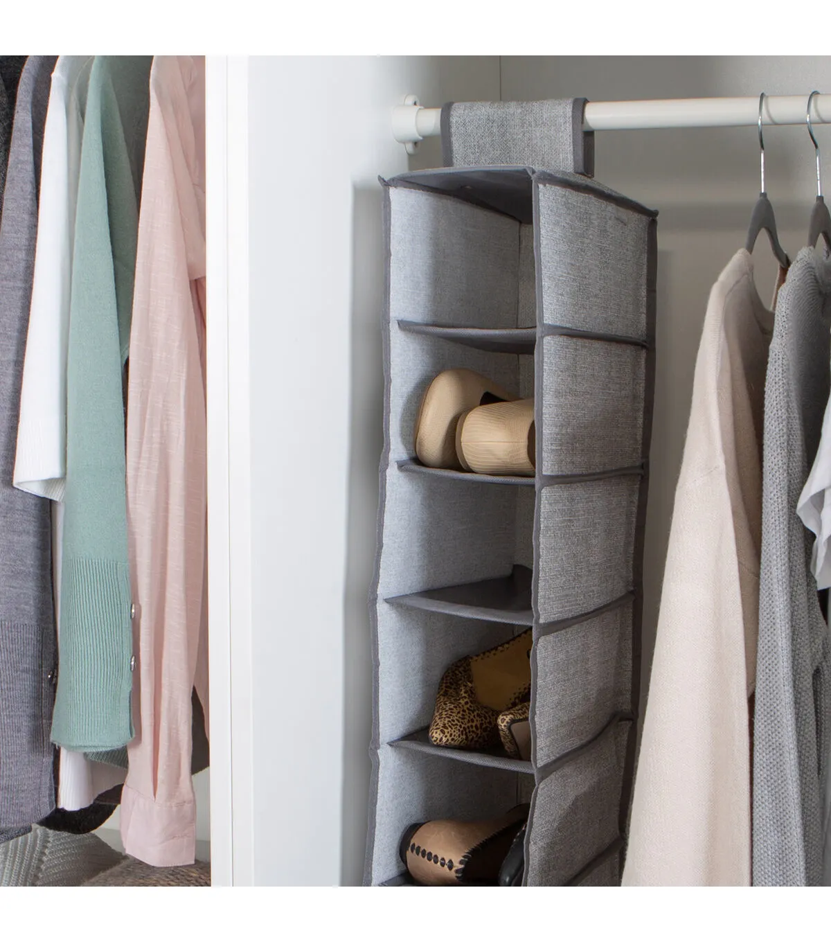 Simplify's 10 Shelf Non-woven Organizer is made of 100% Polypropylene Nonwoven breathable Material that acts as instant organization for your closet or room. Contains 10 cardboard lined shelves to prevent bowing and to allow easy access to all of your shoes and accessories. Sturdy, durable fabric and cardboard liner helps maintain shape of the closet organizer. Easy installation hangs into any closet rods with it's strong Velcro closure, and when not in use, simply fold it up and put in storage, saving space.