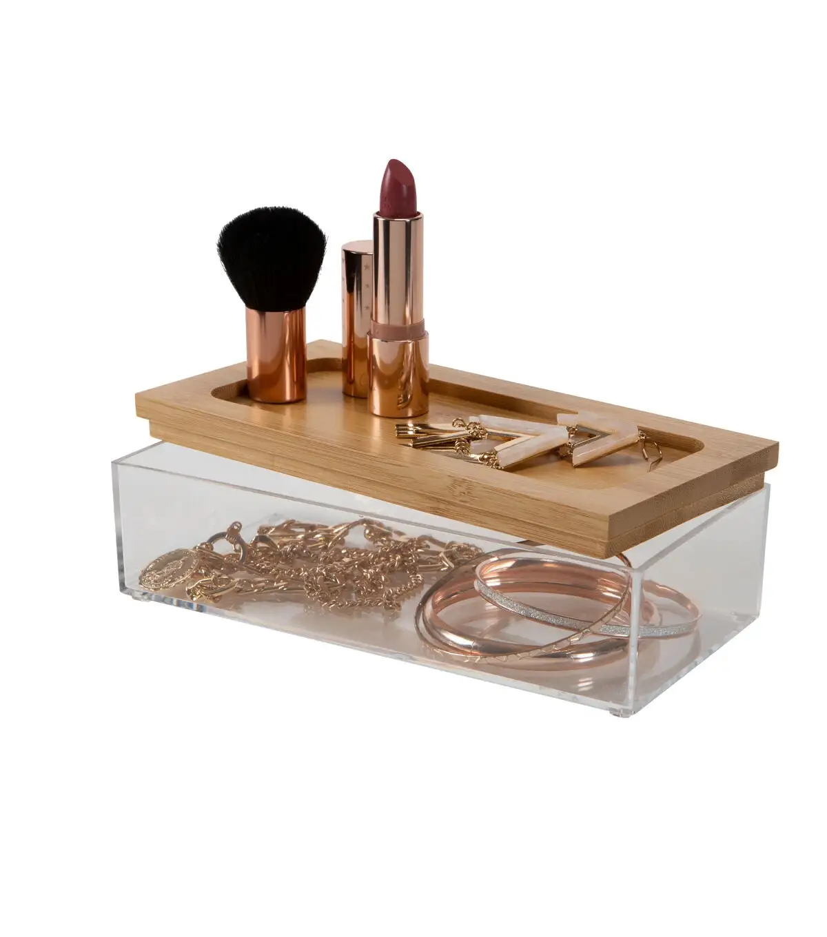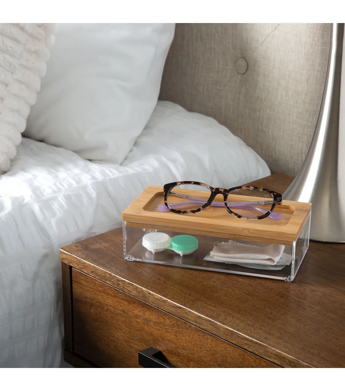 The perfect organizer for your dresser or nightstand, the Simplify clear organizer. Designed as a clear box that allows you to easily see your items inside and completed with a sturdy bamboo lid. Stylish enough to leave out as décor and small enough to fit in a drawer. Perfect for your jewelry or small accessories.