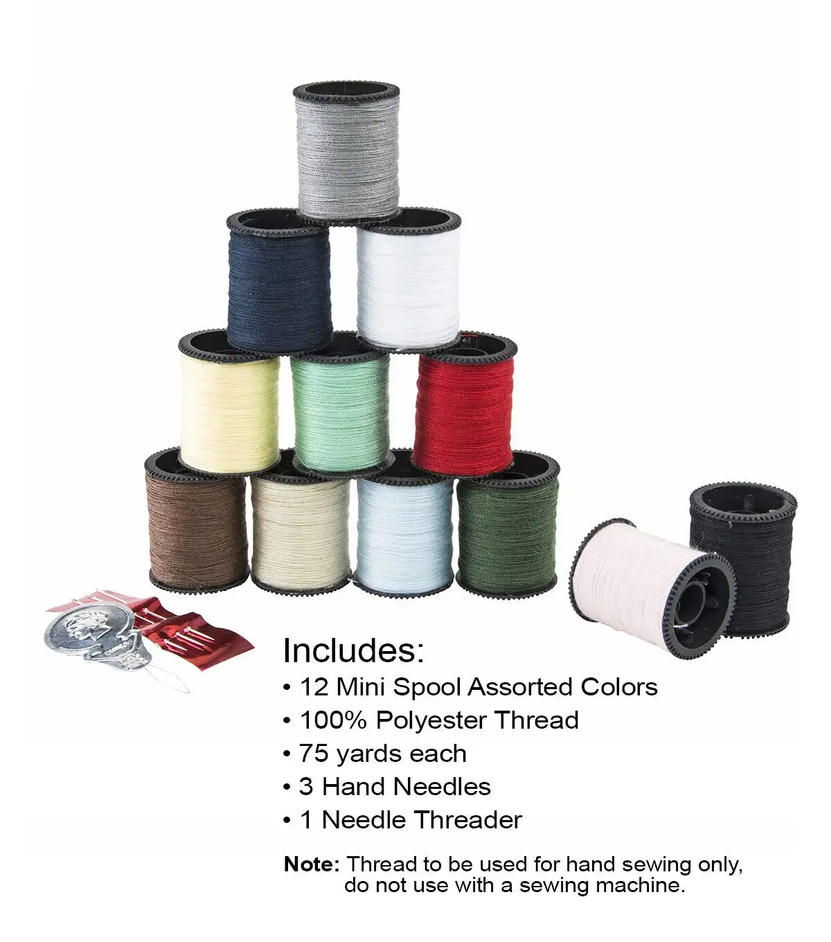 The Singer Polyester Hand Sewing Threads - Assorted Colors offer all you need to begin crafting or making simple clothing repairs. This pack contains 12 mini-spools of assorted colored threads in a variety of hues, three hand needles and a needle threader. Each mini spool comes with 25 yards of 100% polyester hand sewing thread. Bonus needles and needle threader complete the kit ensuring you have all the tools you need to get started on your sewing endeavors.
