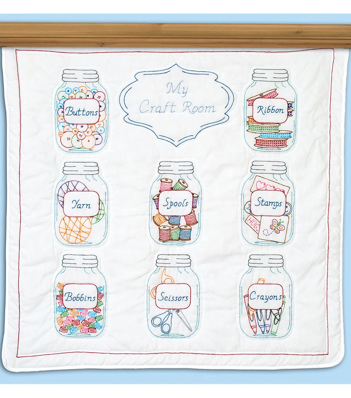 Jack Dempsey-Stamped White Wall Or Lap Quilt. Create a beautiful wall or lap quilt using this great kit. The stitching designs have been stamped using ink that washes away with any liquid and the fabric is a cotton/poly blend broadcloth. This package contains one 36x36 inch wall/lap quilt, instructions for completion and care and a complete list of DMC floss requirements. Hoop, backing, batting, thread and needle sold separately. Design: Mason Jars. Made in USA.