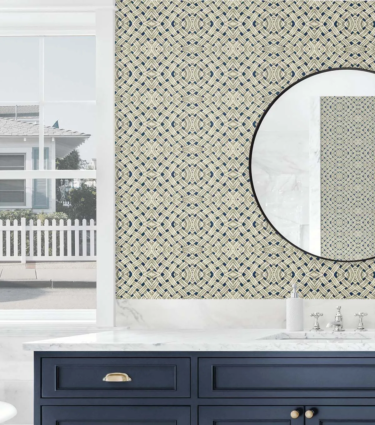 Ropes of jute and sisal twist and intertwine form a graphic modern motif of shifting forms and unexpected patterning. Tommy Bahama Offshore Sailor peel and stick wallpaper is reminiscent of the macrame done by sailors while out at sea. This textural, modern geometric with nautical feel is ready to use, easy to apply, repositionable and 100% removable. DIY friendly. Add dimensional interest to interior walls, furniture, and stair risers with Tommy Bahama Offshore Sailor peel and stick wallpaper. Made in the USA.