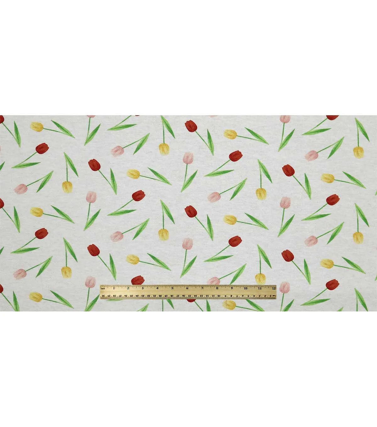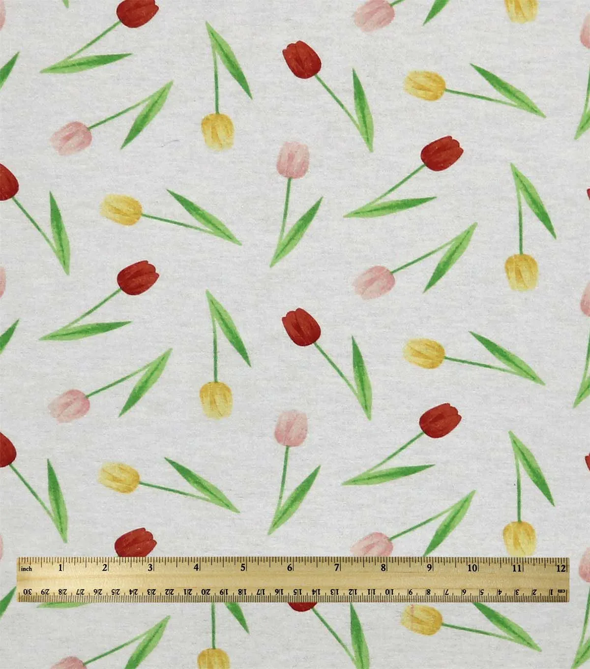 Our Tulips on White Super Snuggle Flannel Fabric is easy to care for. Simply machine wash in cold water, tumble dry on low, and cool iron if needed. Nonchlorine bleach can also be used if necessary. This imported fabric has a width of 42 inches, making it versatile for a variety of projects.