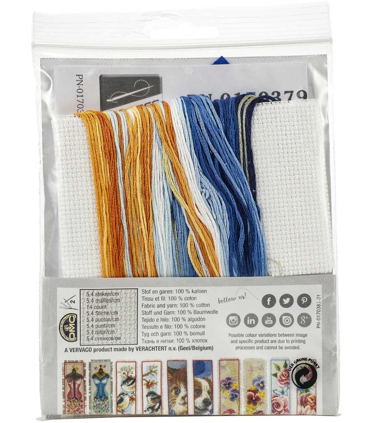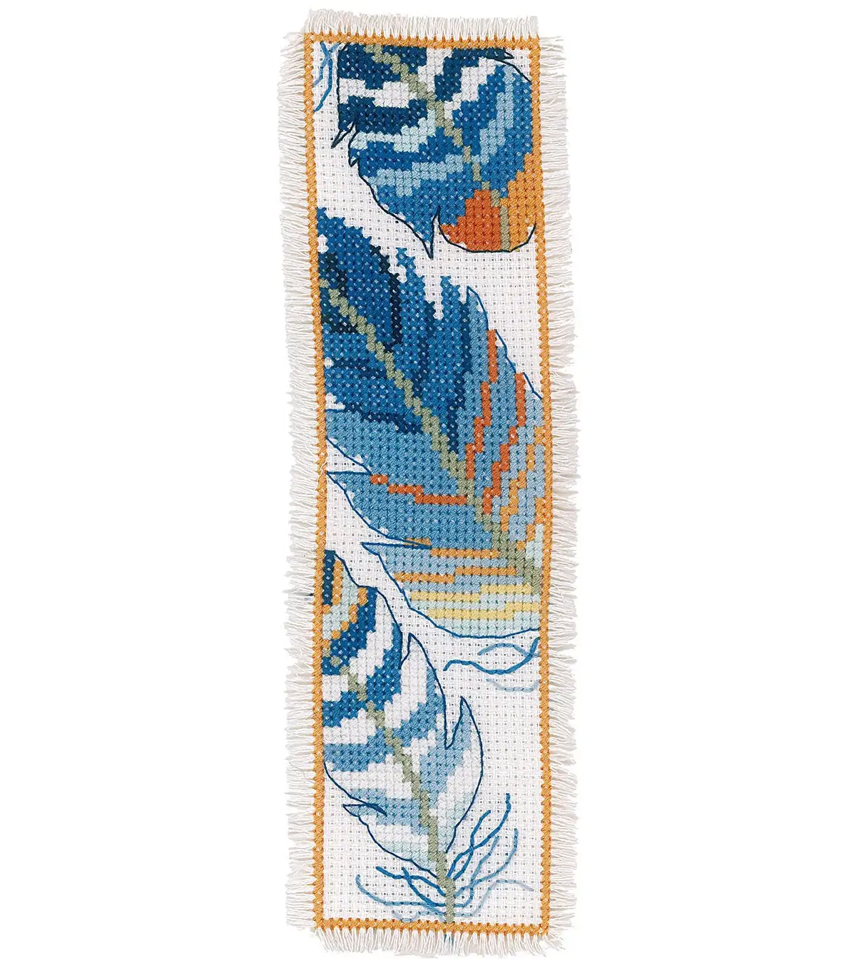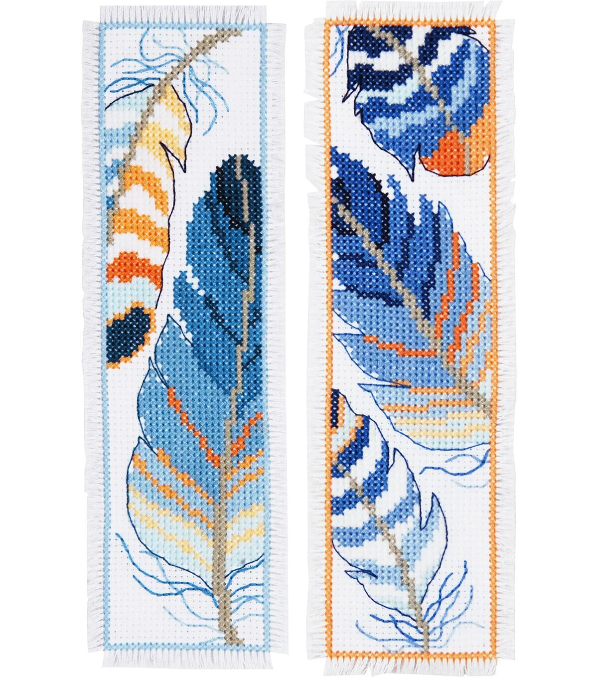 Vervaco creates magnificent designs in classical and modern styles ideal for both beginners and experts alike! Many designs originate from renowned contemporary artists. This package contains 14 count Zweigart 100% cotton Aida fabric, 100% cotton DMC embroidery floss, one needle, a large full-color finished model picture and instructions. Finished Size: two 2.5x8 inch bookmarks. Design: Blue Feathers. Imported.