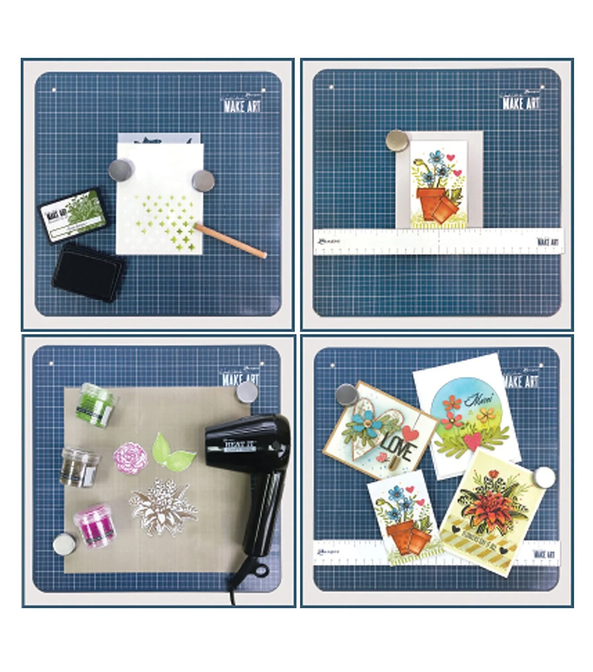 All-in-one magnetic surface for stenciling, aligning, embossing, and creating! This 12.5x12.5 inch package contains one 12x12 inch steel magnetic base with printed grid, four brushed aluminum magnets, and one flexible, magnetic centering ruler. WARNING: Choking Hazard. Not suitable for children under 3 years. Imported.