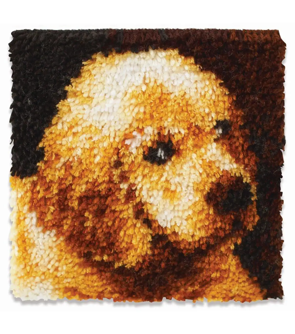 CARON-Wonderart: Latch Hook Kit. This kit will give you a rug that is wonderfully lush and can be made to fit any decor motif. The possibilities are astounding, you can use them on the floor, wall, sofa, bed, window or even make them into pillows, nap-mats and seat cushions. They are easy to make, it would be a wonderful family project! This kit contains a 50% polyester/50% cotton canvas, pre- cut rug yarn, illustrated how to latch hook instructions and an easy-to-follow chart. Hook tool and binding materials are not included. Size: 12x12 inches. Design: Puppy Love. Made in USA.