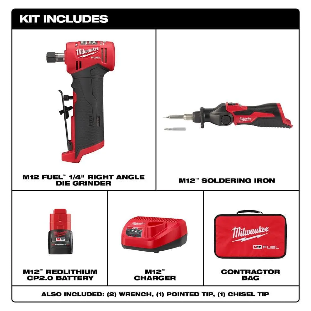 M12 FUEL 12V Lithium-Ion 1/4 in. Cordless Right Angle Die Grinder Kit with M12 Lithium-Ion Cordless Soldering Iron