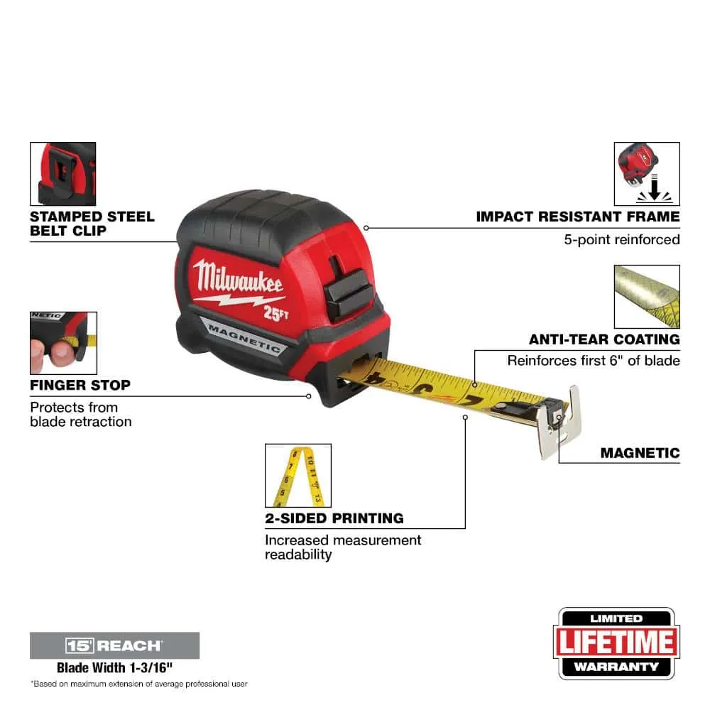 25 ft. x 1-1/16 in. Compact Magnetic Tape Measure with 15 ft. Reach