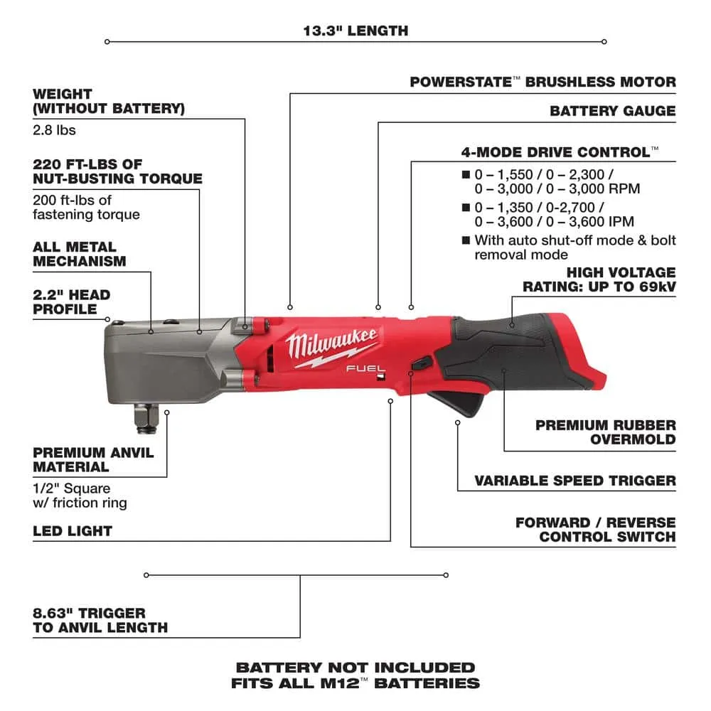 M12 FUEL 12V Lithium-Ion Brushless Cordless 1/2 in. Right Angle Impact Wrench (Tool-Only)
