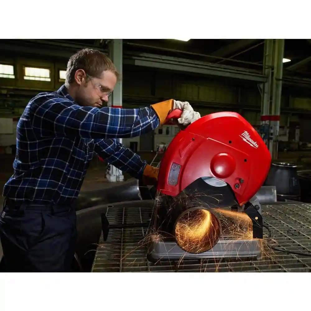 description: Durable and powerful with a 15 Amp, 4 MAX HP motor, the Milwaukee 14 in. Abrasive Cutoff Machine delivers exceptional and long-lasting performance. With speeds up to 3900 RPM, you can cut drywall track in bundles, angle iron, conduit, pipe, channels, tubing and rebar up to a 5 in. capacity quickly and with accuracy. The lightweight design allows easy portability without sacrificing durability, while the oversize wheel guards provide added protection from debris. Featuring a 45 miter capacity with an adjustable fence for quick and accurate miter cuts without flipping heavy material, the large spindle lock button provides quick and easy blade changes for less downtime and the quick adjust vise clamp allows quick clamp adjustment when cutting different material sizes.depth: 14.38 inheight: 16.25 inwidth: 22.75 inweight: 42.5 lb