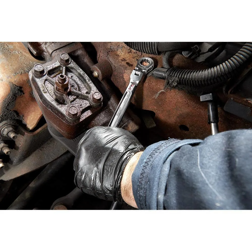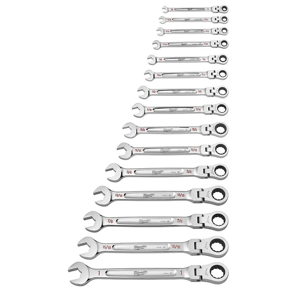 description: The Milwaukee 30-Piece SAE and METRIC Flex Head Ratcheting Combination Wrench Set features 2.5掳 of arc swing and 144 ratcheting positions, allowing quick and efficient work in tight spaces. The flex head wrenches have double-stacked pawls within the ratcheting mechanism, which increases durability and extends the life of the tools. The flexible head gives users increased accessibility in difficult-to-reach areas. The MAXBITE Open-End Grip improves the wrench's grip on nuts and bolts, offering users 25% more torque than smooth-faced wrenches. This flex head wrench set feature ergonomic I-Beam handles designed for improved comfort and ink-filled size labels for easy size identification and quick distinction between SAE and METRIC sets. The 30-piece ratcheting combination wrench set comes in two trays designed for steel storage drawers for efficient storage with no wasted space. Milwaukee combination wrenches feature a lifetime guarantee.