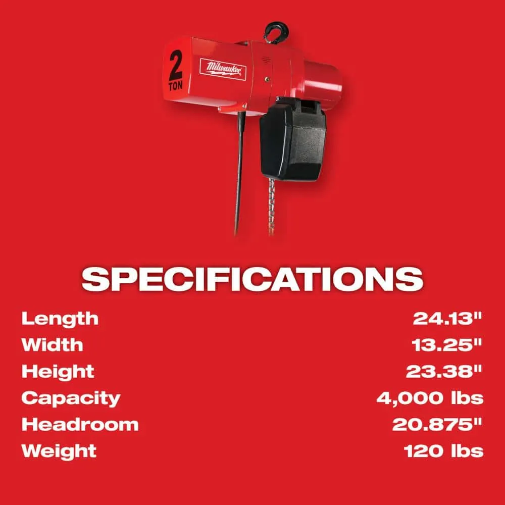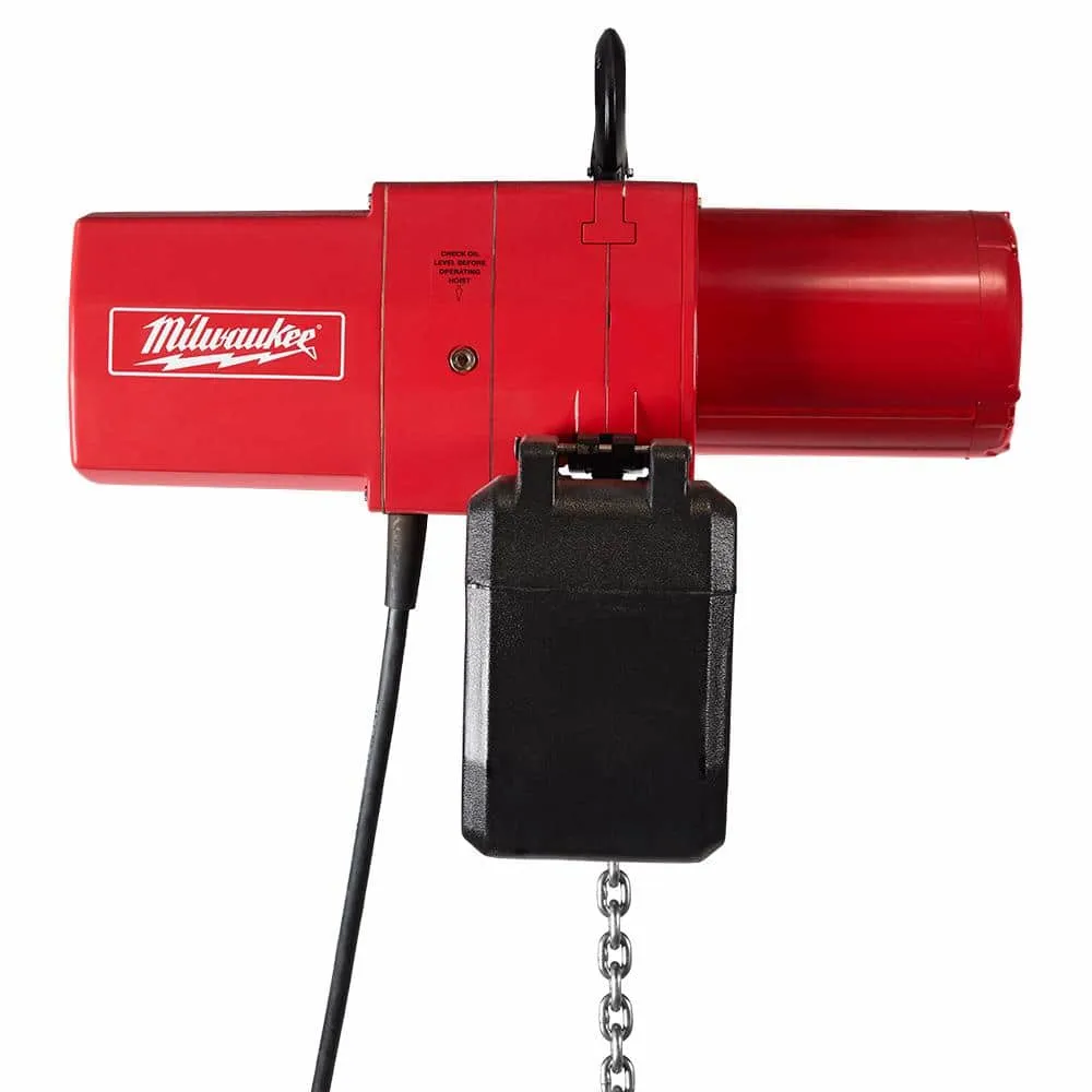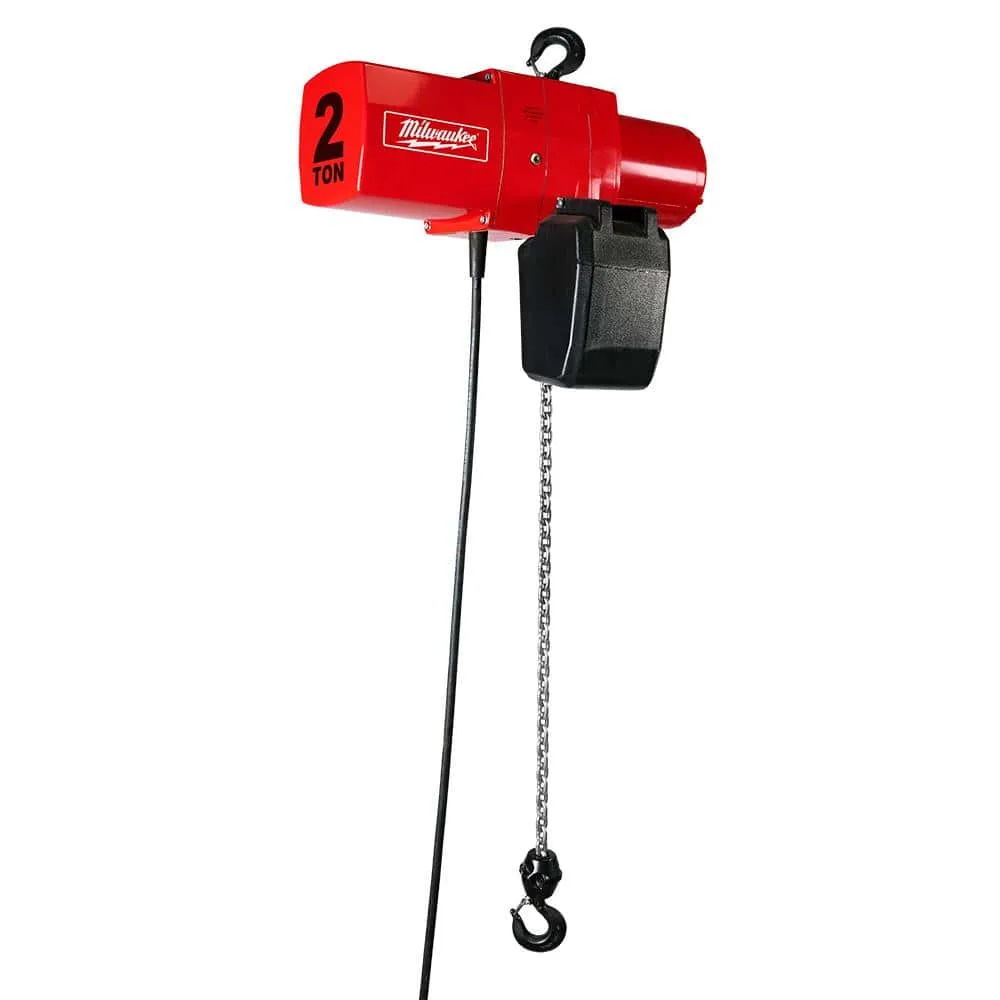 description: All Milwaukee Professional Electric Chain Hoists offer an array of load lift and height options. With 1/2-Ton to 2-Ton capacities and 10 ft. to 20 ft. lifting heights, you can order a Milwaukee Electric Chain Hoist to meet your roughest needs. All offer a multi-disc magnetic brake for positive load holding and spotting. Adjustable upper and lower limit switches, overload limiting clutch and latch-type ridged top hook. You can get single or 3-phase voltage motors to meet your operation power requirements. The 24-Volt pushbutton station fits easily in your hand to allow thumb, trigger or 2-handed operation.depth: 12 inheight: 17.0 inwidth: 27 inweight: 113 lb