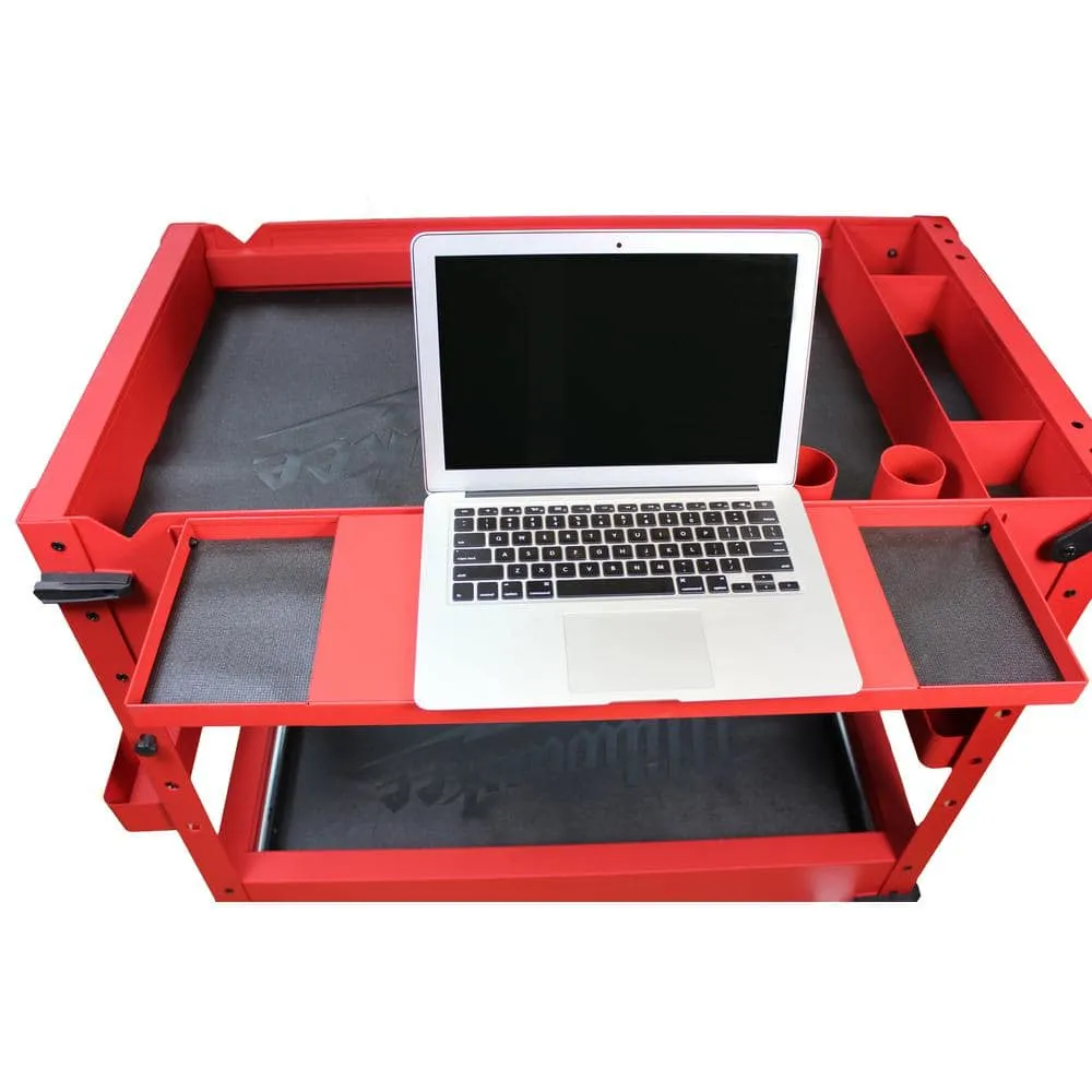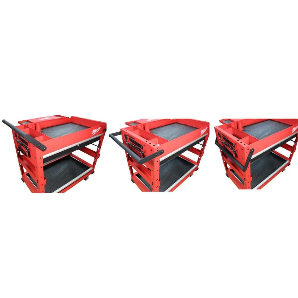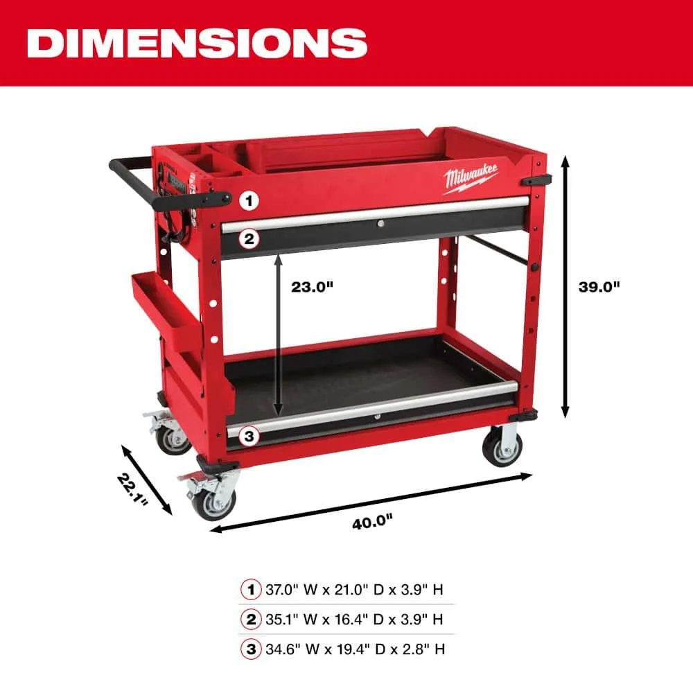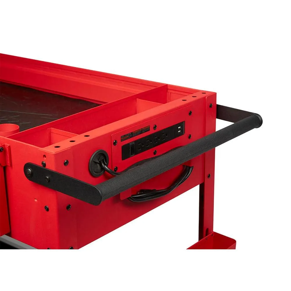 description: The Milwaukee 40 in. Steel Work Cart is loaded with innovative features to accomplish jobs faster and more efficiently. The large top tray supports up to 300 lbs. and includes a 3-section tray for parts and two removable storage cups. The cups can be flipped upside down to create a flush surface or completely removed for vertical long tool storage. The convenient fold-out work tray holds laptops at a comfortable working height, 36 in. above the floor. The built-in power center allows users to charge electronics, tools, and battery packs all in one place. The power cord can be safely stored out of the way on the cord hooks. The sliding bottom tray has heavy-duty 200 lbs. soft-close drawer slides to easily stow larger items like air compressors or PACKOUT organizers.depth: 22.1 inheight: 39 inwidth: 40 inweight: 700 lb