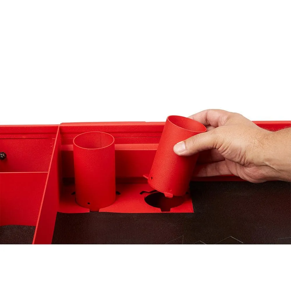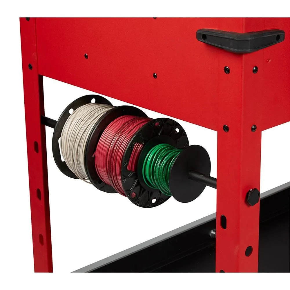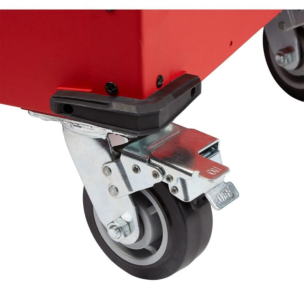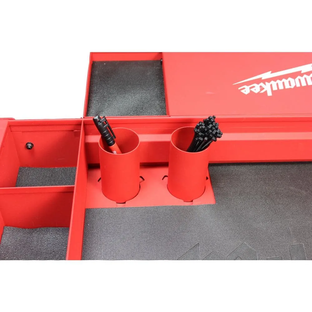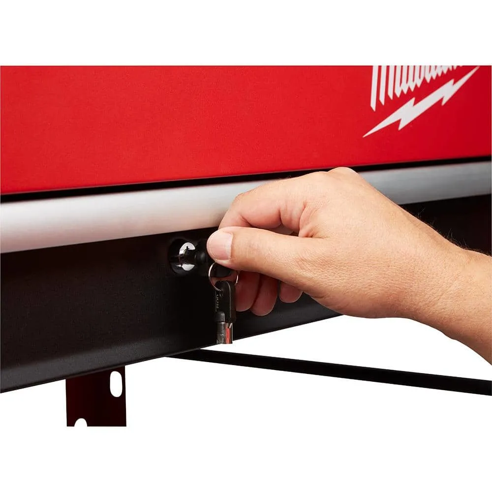 description: The Milwaukee 40 in. Steel Work Cart is loaded with innovative features to accomplish jobs faster and more efficiently. The large top tray supports up to 300 lbs. and includes a 3-section tray for parts and two removable storage cups. The cups can be flipped upside down to create a flush surface or completely removed for vertical long tool storage. The convenient fold-out work tray holds laptops at a comfortable working height, 36 in. above the floor. The built-in power center allows users to charge electronics, tools, and battery packs all in one place. The power cord can be safely stored out of the way on the cord hooks. The sliding bottom tray has heavy-duty 200 lbs. soft-close drawer slides to easily stow larger items like air compressors or PACKOUT organizers.depth: 22.1 inheight: 39 inwidth: 40 inweight: 700 lb