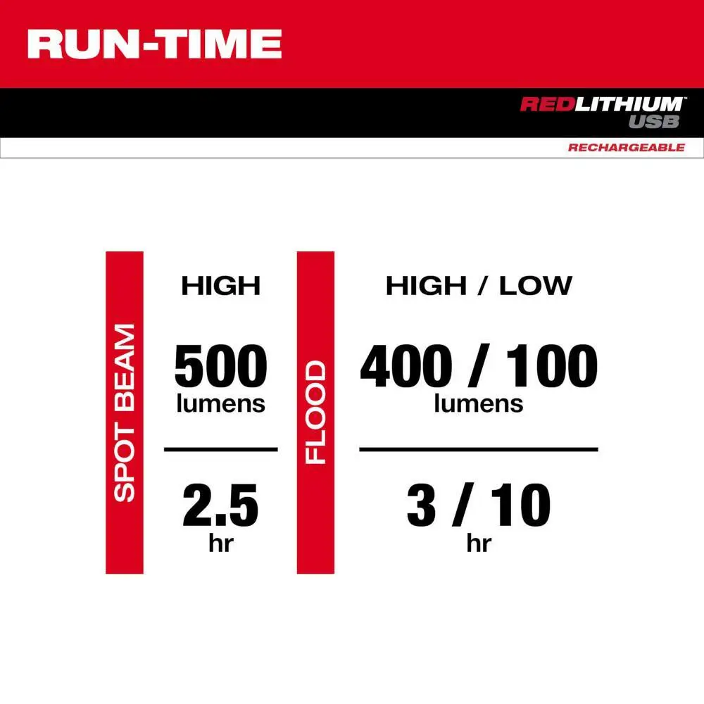 description: The MILWAUKEE REDLITHIUM USB Pivoting Flashlight offers high output in any task and any position. It's powered by REDLITHIUM USB, giving you high output light for any task from any position. The flashlight features spot and flood beam modes allowing you to change it from a high-powered flashlight to a versatile task light with the press of a button. With 500 lumens of TRUEVIEW High Definition Output and a 155-meter (377 feet) spot beam distance, it gives you the ability to search, trace, or inspect better from farther away. In flood mode, the LED flashlight's 110掳 pivoting light head and magnet base provides you with hands-free task light, while directing the light exactly where they need it. Maximize brightness or extend runtime with high and low flood mode options with up to 12 hours of runtime. Turn the flashlight into a right-angle light with a built-in pocket clip designed for chest pockets and straps. The REDLITHIUM USB Pivoting Flashlight is powered by the REDLITHIUM USB 3.0AH Battery, providing all-day run-time, more recharges, and 3x faster charge time. The MILWAUKEE REDLITHIUM USB Battery can be recharged in the flashlight via Micro USB or swapped out with additional REDLITHIUM USB Batteries for virtually no downtime. The MILWAUKEE REDLITHIUM USB Pivoting Flashlight is great for any trade professional looking for the ultimate lighting versatility and is covered by a limited lifetime warranty.depth: 6.125 inheight: 1.375 inwidth: 1.375 inweight: .61 lb