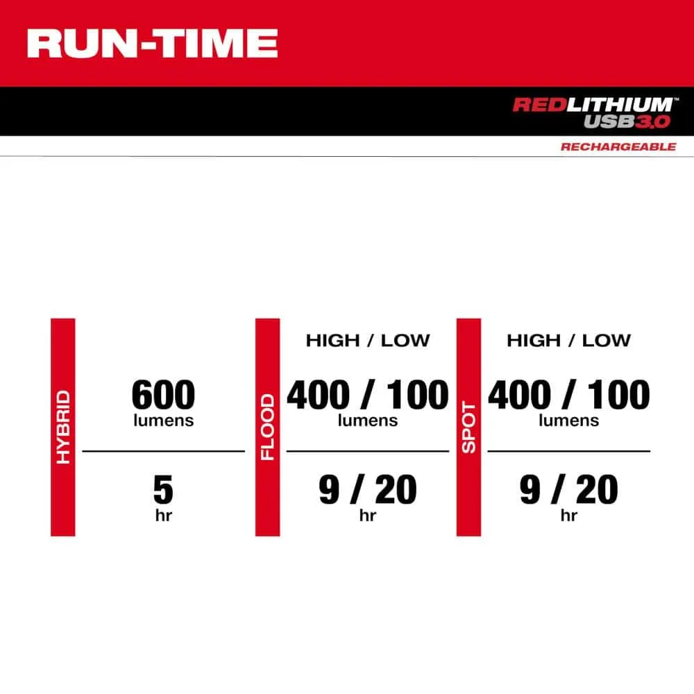 description: The MILWAUKEE REDLITHIUM USB Hard Hat Headlamp is 20% LIGHTER WEIGHT, BRIGHTER, and offers MORE RUNTIME. This high output, compact headlamp is all powered by the REDLITHIUM USB Battery. This rechargeable headlamp is a lightweight and compact design that delivers 600 lumens of TRUEVIEW HIGH-DEFINITION OUTPUT with hybrid, spot, and flood modes. The headlamp easily detaches from the bracket for easy charging and to help get light into those hard-to-reach places. You can now optimize the position of the light with 180 degrees of mobility and 5 different output modes. This headlamp is IP54 rated as weather and dust resistant and survives impacts from up to 2 meters to withstand harsh job site conditions. The REDLITHIUM USB Hard Hat Headlamp is powered by the REDLITHIUM USB 3.0AH Battery, providing all-day run-time, more recharges, and 3x faster charge time. The REDLITHIUM USB Battery can be recharged in the flashlight via USB - C or swapped out with additional REDLITHIUM USB Batteries for virtually no downtime. The REDLITHIUM USB Hard Hat Headlamp is covered by a limited lifetime warranty.depth: 2.12 inheight: 1.34 inwidth: 4.05 inweight: .33 lb