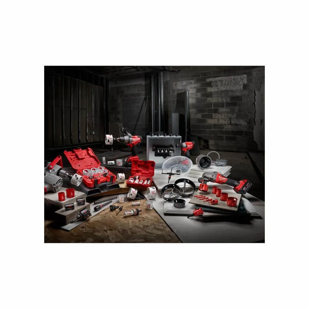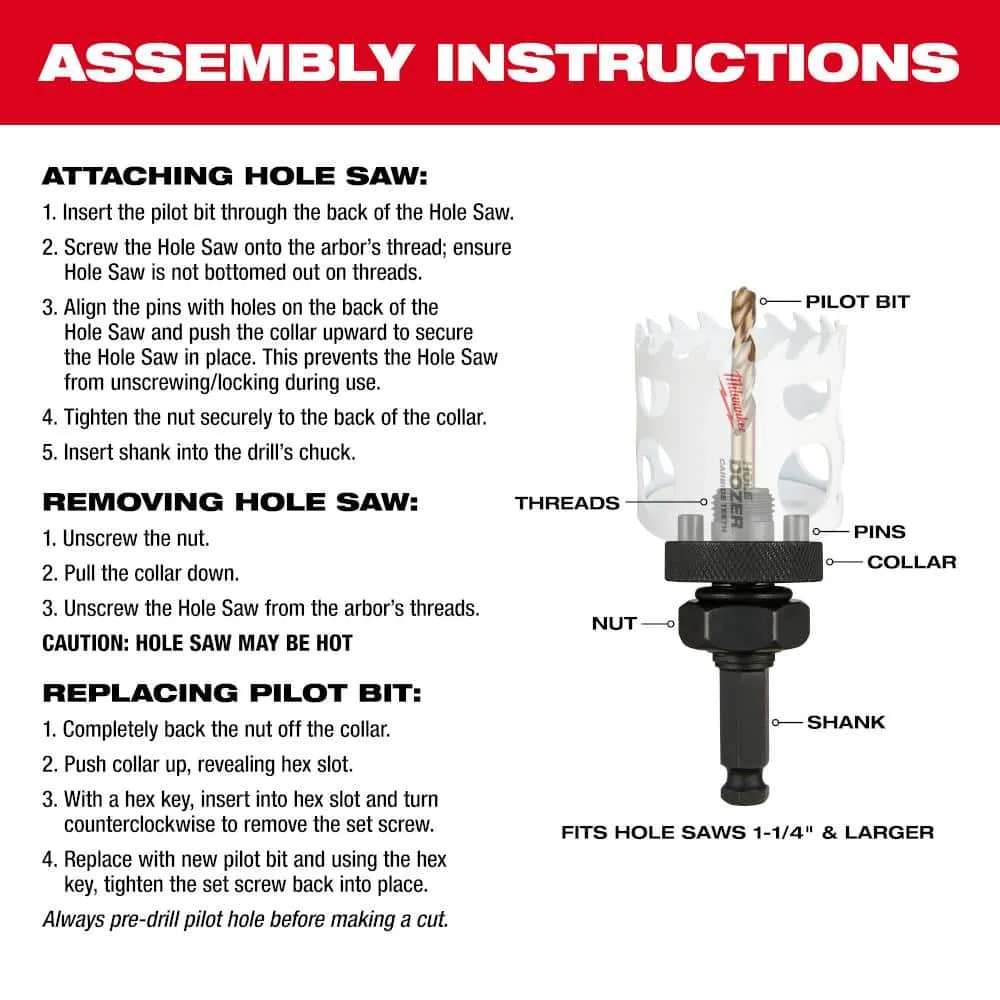 description: Milwaukee hole saw arbors are made from hardened carbon steel and alloy steel for greater durability. The 49-56-9100 features a 7/16 in. hex shank, which can be used with any 7/16 in. extension. The 49-56-9100 also features a drive plate which is tightened up to the hole saw to eliminate wobble between the arbor and hole saw.depth: 3height: 5.9 inwidth: 3.6 in