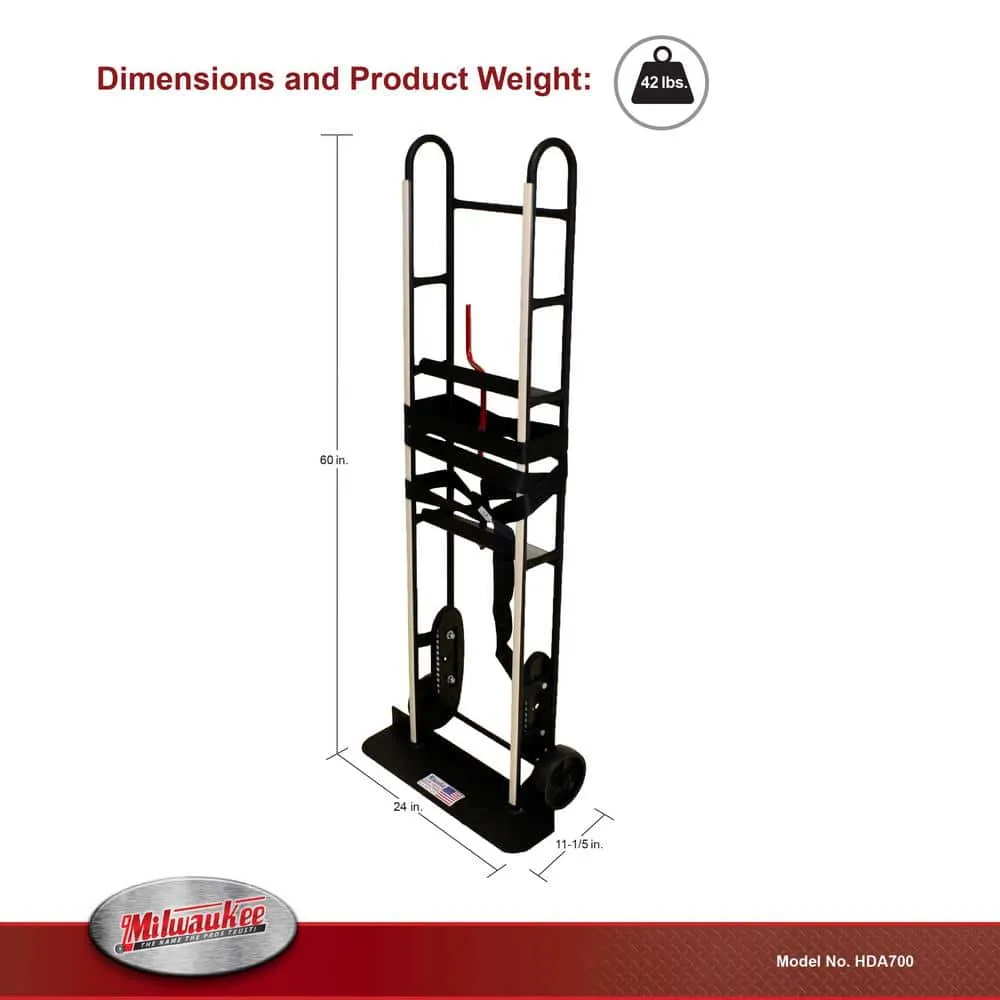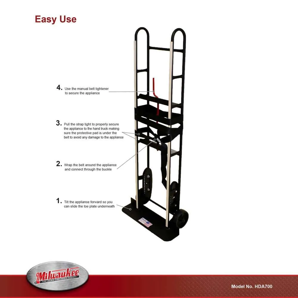 description: The Milwaukee 800 lb. Capacity Appliance Truck delivers a hand truck capable of helping you move large appliances and furniture safely with ease. This hand truck features durable steel construction and a load strap for safety. The load strap tightens easily to help secure your load. Built-in stair climbers help you negotiate curbs and stairs. The duo durometer protective pads secure tightly to the tubular frame while protecting the load from contact with the steel frame.depth: 11.5 inheight: 60 inwidth: 24 inweight: 42 lb