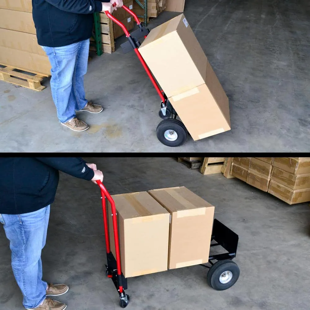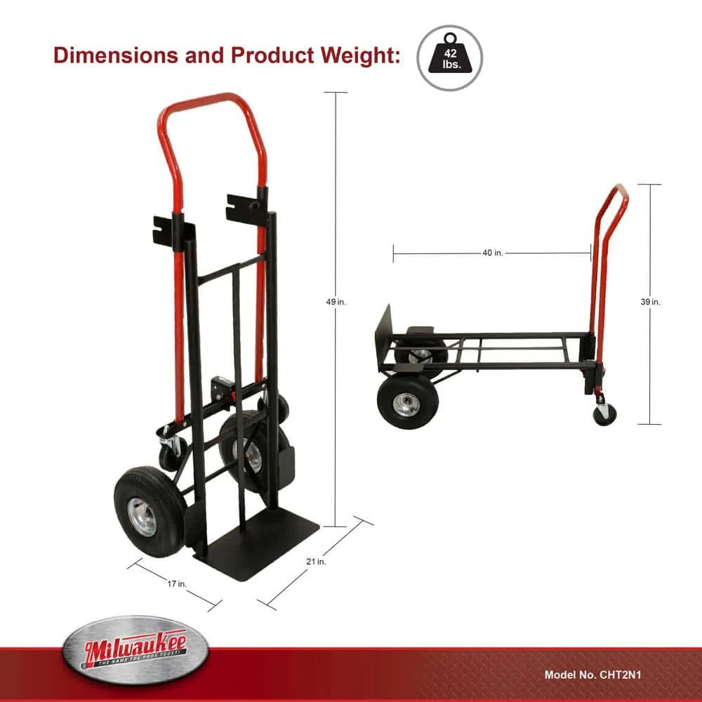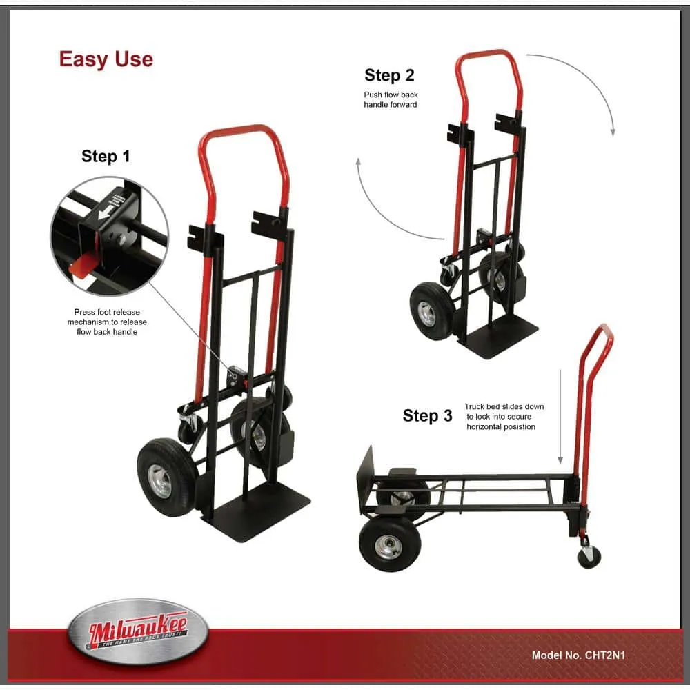 description: This Milwaukee Heavy-Duty Convertible Truck has an 800 lbs. load capacity. It easily converts from a 2-wheel vertical truck to a 4-wheel platform cart by pressing down with your foot on the handle release mechanism. There are no pins to pull to adjust the handle position. Flow back handle allows for one or two hand operation. The 10 in. pneumatic tires cushion the load and allow the truck to roll over uneven surfaces. The 4 in. swivel casters give the truck increased maneuverability in cart position.depth: 17.5 inheight: 49 inwidth: 21.5 inweight: 32 lb