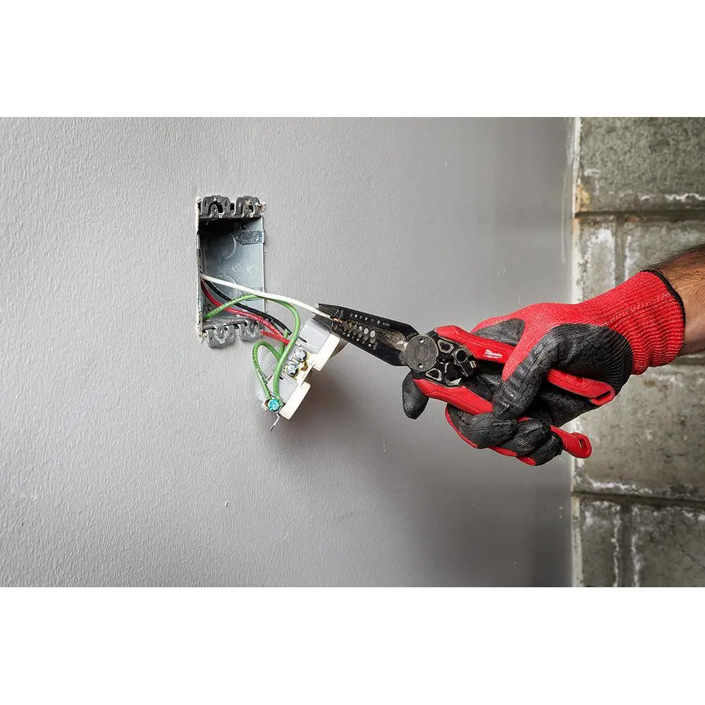 description: The Milwaukee 7-in-1 High-Leverage Combination Pliers feature seven core functions for electrical installation. These Milwaukee pliers feature a crimper, wire cutter, wire stripper, loop maker, reamer, and bolt cutter. The wide jaw pliers make grabbing and twisting wire easy, while the crimper provides users with added functionality when working with both insulated and non-insulated terminals. The wire cutter, wire stripper, and loop maker allow users to make quick wire preparation. The built-in reamer allows users to ream ? in. through 1 in. conduit, while the bolt cutter cuts #6 and #8 bolts. A swing-lock design delivers fast, 1-handed operation, and the high-leverage handles make cutting and crimping easier. The 7-in-1 electrical pliers provide maximum productivity and are perfect for the toughest jobsites.depth: 9 inheight: 0.9 inwidth: 2.15 in