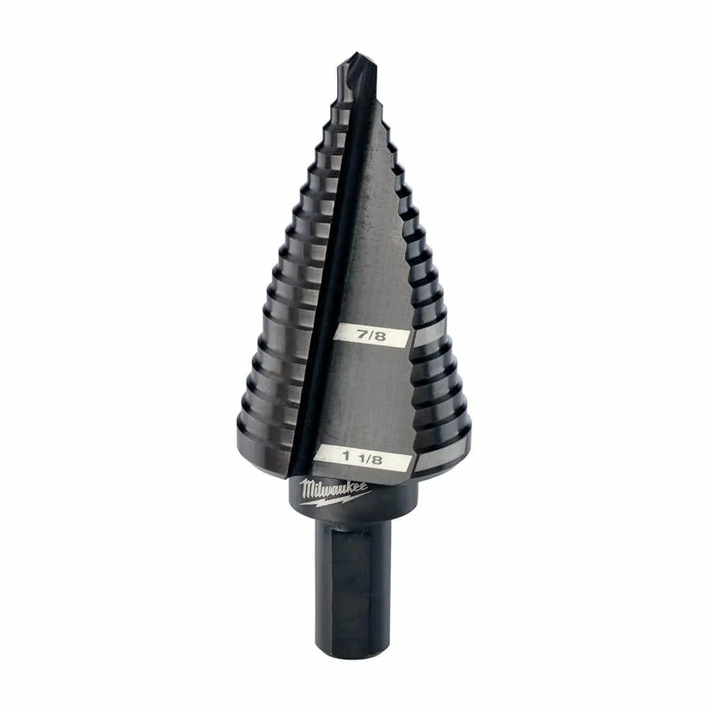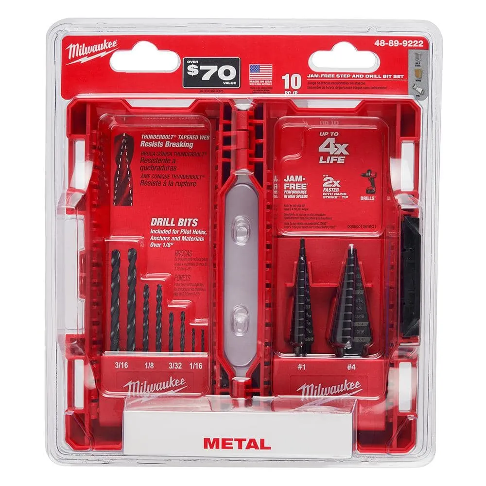 description: The 10 piece MILWAUKEE Step Drill Bit Kit is perfect for drilling large and small diameter holes in steel and plastic. The step drill bits give jam-free performance optimized for cordless drills in high speed. The dual-flute design creates quicker holes, longer life and more work time per battery charge. The Rapid Strike tips facilitate fast, accurate starts that generate less heat and give longer bit tip life. Black oxide coating enhances the step bits' durability, hole quality, and bit life. Each bit has laser-engraved reference marks for ease of use and convenience while drilling. The 3-flat Secure-Grip shank ensures a solid connection with the drill chuck.