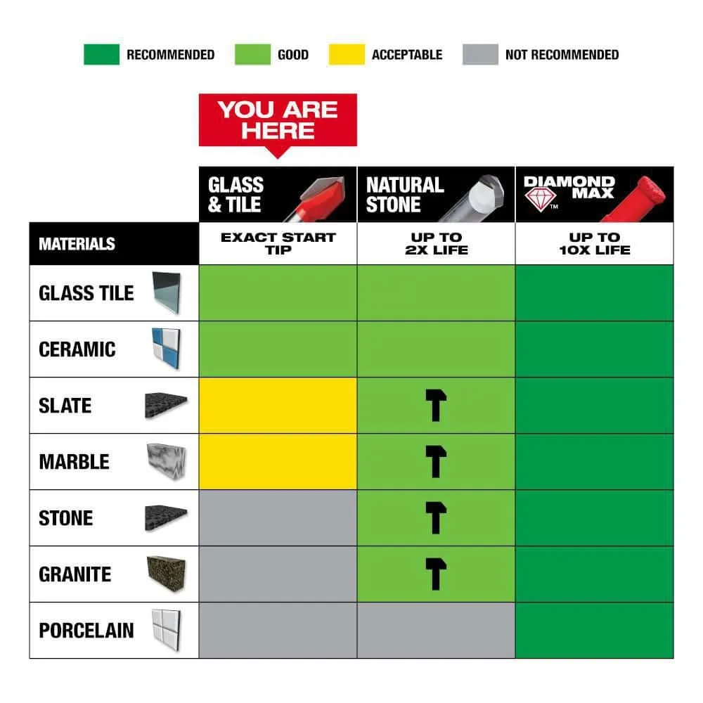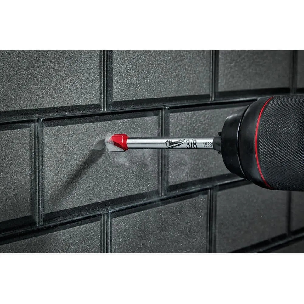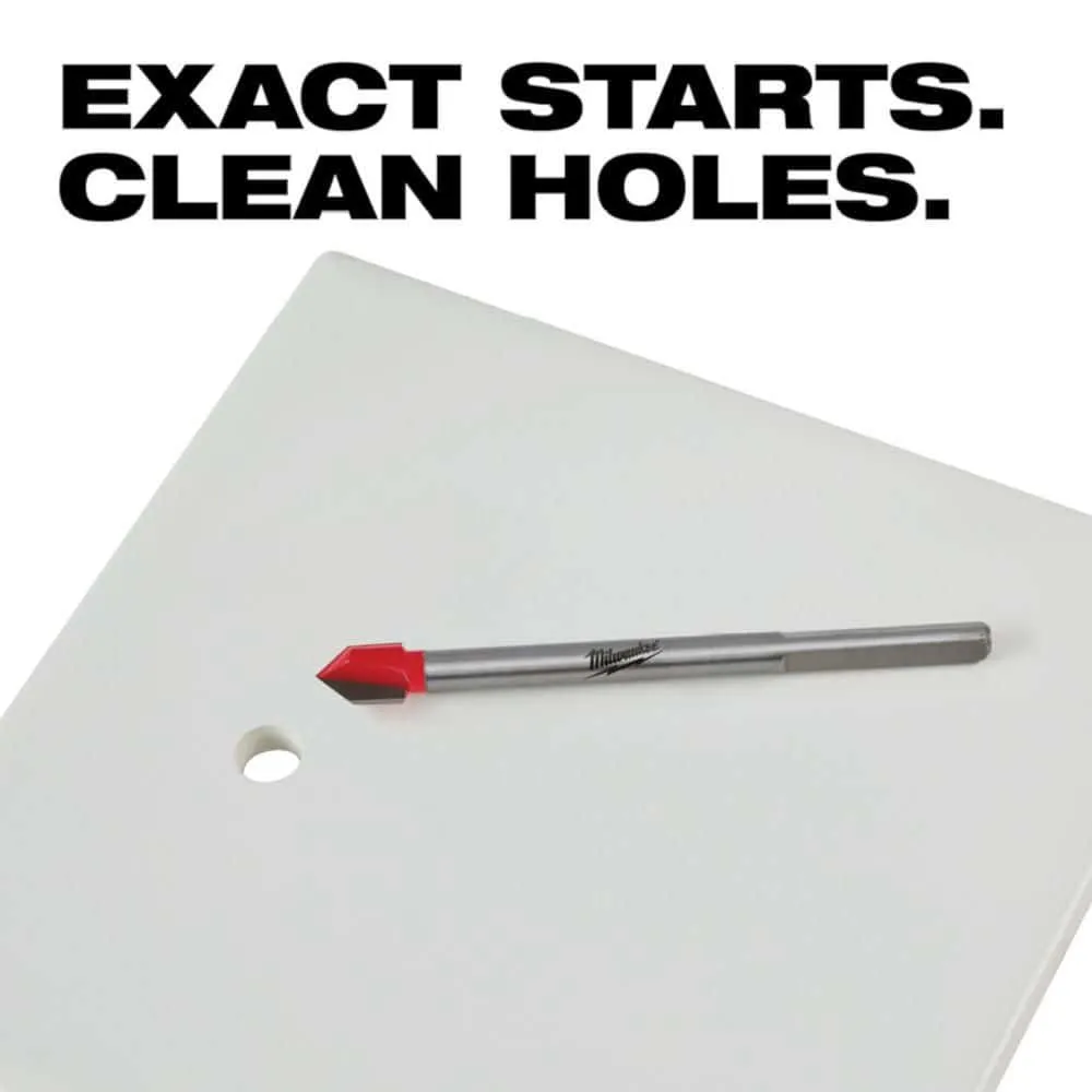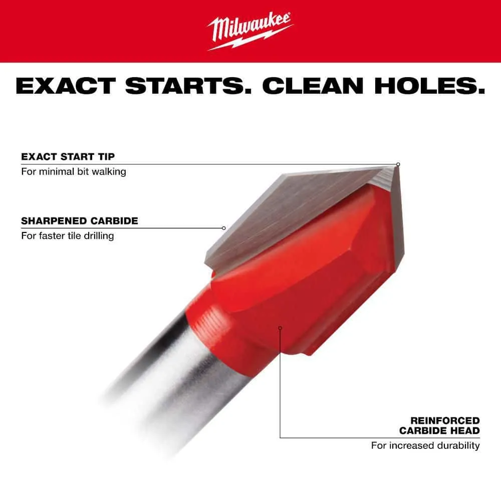 description: The Milwaukee 4-Piece Glass and Tile Drill Bit features an exact start tip for clean holes and minimal bit walking in glass and ceramic tile. Engineered with sharpened carbide, Milwaukee Glass and Tile Bits provide faster tile drilling than standard glass and tile bits. These bits are designed with a reinforced carbide head for increased durability when high-speed drilling into tile and glass. They're specifically designed for drilling holes in glass and ceramic tile with drill-drivers only. These drill bits are not recommended for use on porcelain tile. This drill bit set includes one 1/8 in., one 3/16 in., one 1/4 in. and one 5/16 in. glass and tile bits.