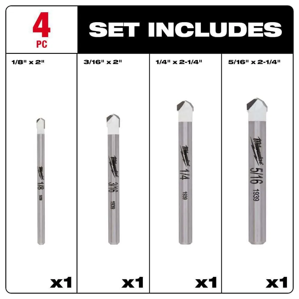 description: The Milwaukee 4-Piece Tile and Natural Stone Drill Bit Set delivers up to 2X life in granite, stone, ceramic tile and glass. These bits are designed for use in hammer mode, providing faster drilling speeds when drilling into natural stone tiles, like granite and marble. Equipped with an aggressive 8-grind carbide head, these bits deliver up to 20% faster drilling. The bit's reinforced tip protects the carbide head, providing the durability needed for use in hammer drill mode. Milwaukee Tile and Natural Stone Bits can be used in drill-only mode or hammer drill-mode and are not recommended for porcelain tile. This kit includes one 1/8 in., one 3/16 in., one 1/4 in. and one 5/16 in. drill bit for natural stone.